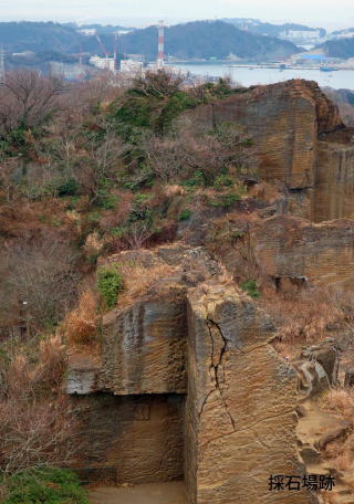 期待した鷹取山からの眺めは晴れてれば遠く日光、筑波、富士、箱根が望めるというが残念にも見えなかった。しかし横浜港や横須賀港、追浜の工業地帯や逗子市、横須賀市の町が一望でき、かつ鷹取山の凝灰岩で覆われた様子や石切り場跡の全景を真下に見ることができた。