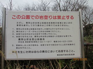 ちょうど正午近くに鷹取山到着、ここでまず目に飛び込んできたのは高さ20m、横幅10mもあろう岩壁をロッククライミングに興ずる数人のグループだ。第一印象は若くない、中高年のオジサン、オバサンたちがワイワイ言いながら楽しんでいるではないか。若者のボルタリングのイメージとは異種のものと察した。ここでのクライミングの条件は @公認指導員がつく A参加者は鷹取山安全登山協議会への登録 B実施日の届け出 と大きな看板に書かれていた。しばし見学してから昼食に向った。