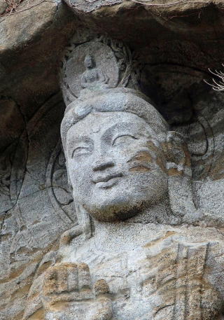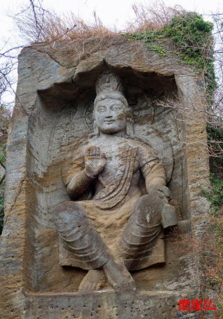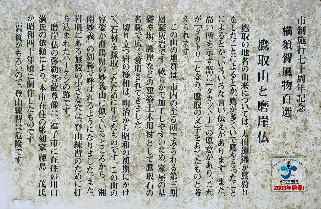 山頂広場から15分も歩くと目の前に磨崖仏が現れた。これは岩壁を利用して彫られた大きな弥勒菩薩で、地元逗子市在住の彫刻家によって、昭和40年頃にに作られたという。左ほおに大きな傷があったのが気になった。心無いクライマーの悪戯なのだろうか。ハーケンの跡がないのがせめてもの救い。下山は雨も降りだす気配だったので一路追浜駅を目指して歩いた。