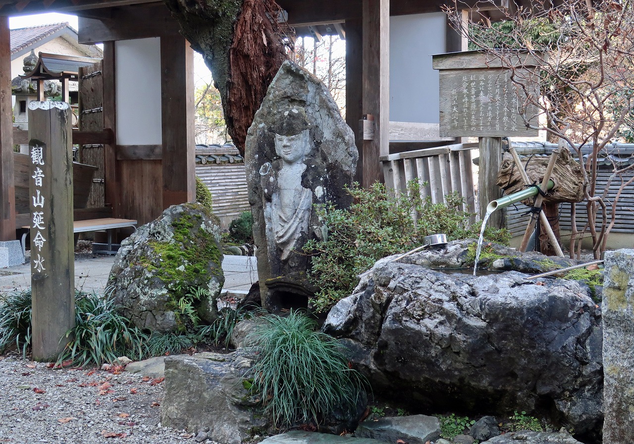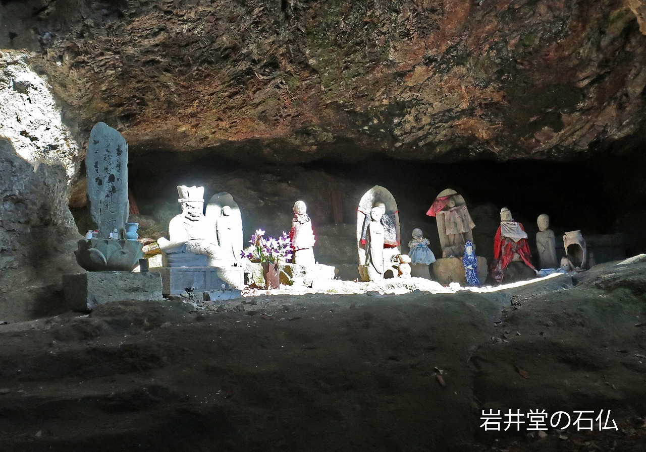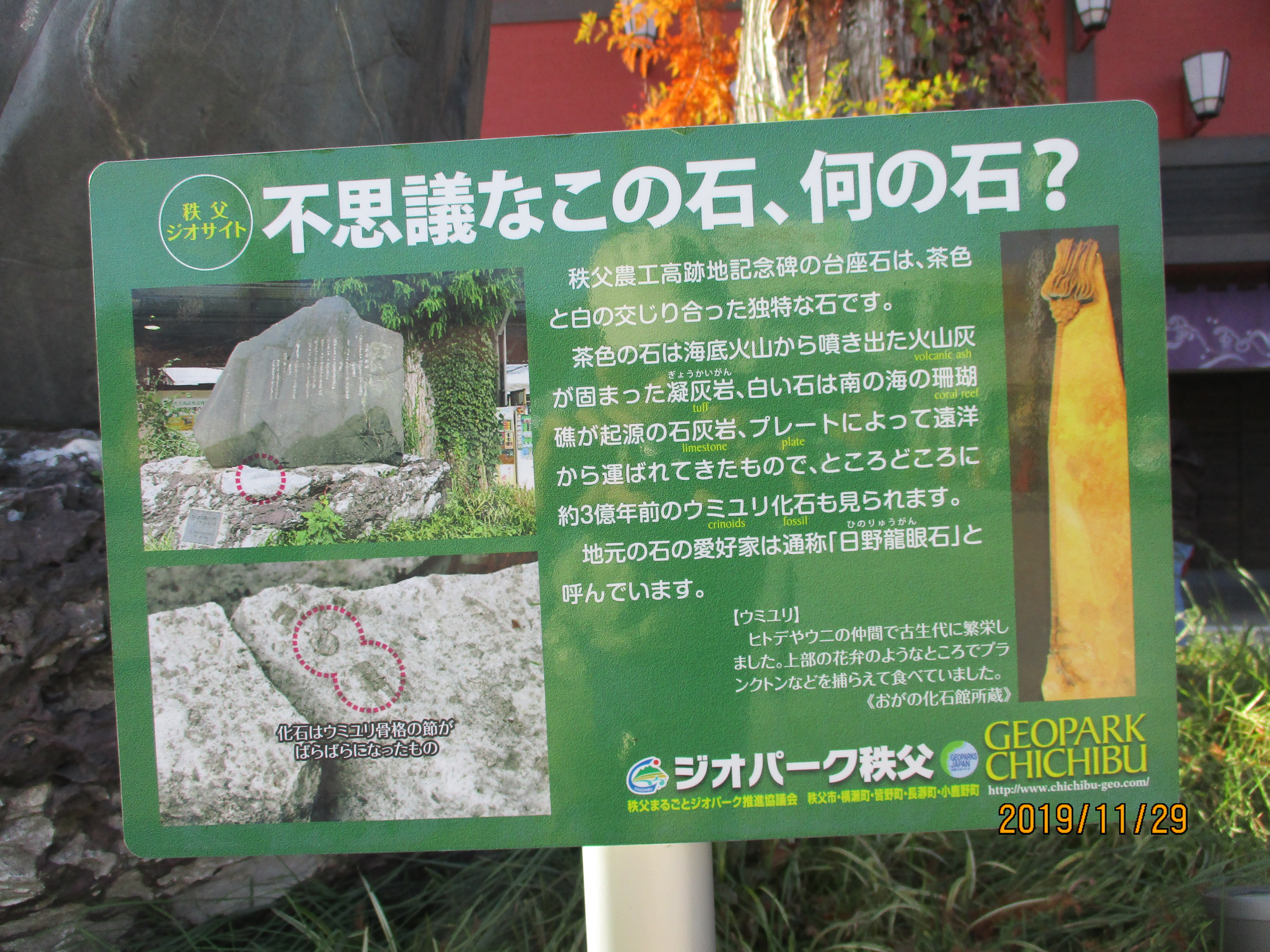 影森駅西口前で山口さんの指示の下で準備体操をしてから、今日のリーダーである門馬さんを先頭に歩き出す。札所番号が書かれている案内板に従って小道に入り、秩父鉄道の踏切を渡ると正面が秩父札所二十七番大淵寺で、寺の後上方に護国観音を仰ぎ見る。大淵寺の石段を登ると境内に「観音山延命水」という名の水場があり、この水を飲むと33ヶ月長生きするとのこと。僅かに登ると月影堂で、ここから山道になる。最初は荒れた所があって台風19号の影響が気になったが、その後は道が崩れている所はなかった。一登りで護国観音に着く。護国観音は五十五尺九寸(約17m)の高さがあり、ゴコクの語呂合わせと言われる。ここから恐竜の背中の様な両神山やマッターホルンの様な二子山がよく見える。露岩交じりの道を登り、安全を確かめながら鉄橋を渡ると、秩父札所二十六番円融寺の奥の院岩井堂の下に着く。岩井堂は巨岩の下の斜面に設けられた長い柱の上に立っていて、京都の清水寺の様な造りになっていている。岩井堂に上がっても残念ながら展望は得られない。堂には千社札が目一杯に貼られていて見苦しく感じる。なお、帰宅後に千社札に関するHPを探したら下記の記載があった。