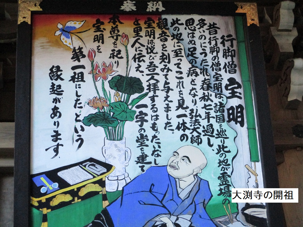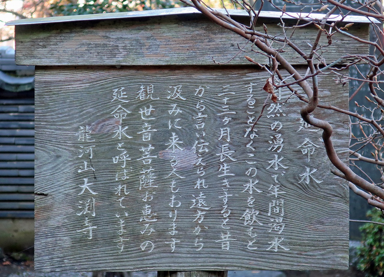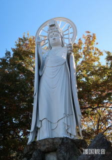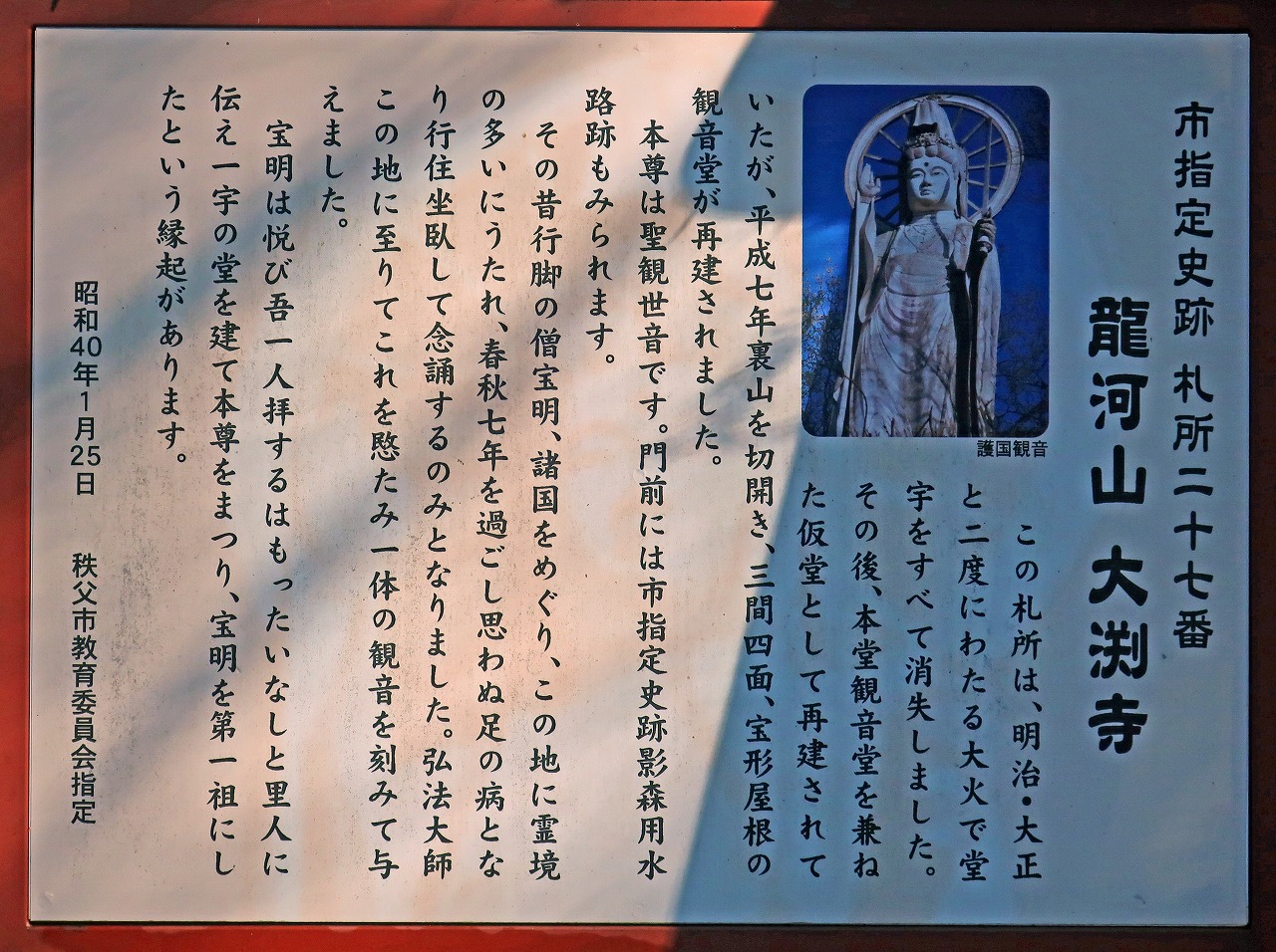 影森駅西口前で山口さんの指示の下で準備体操をしてから、今日のリーダーである門馬さんを先頭に歩き出す。札所番号が書かれている案内板に従って小道に入り、秩父鉄道の踏切を渡ると正面が秩父札所二十七番大淵寺で、寺の後上方に護国観音を仰ぎ見る。大淵寺の石段を登ると境内に「観音山延命水」という名の水場があり、この水を飲むと33ヶ月長生きするとのこと。僅かに登ると月影堂で、ここから山道になる。最初は荒れた所があって台風19号の影響が気になったが、その後は道が崩れている所はなかった。一登りで護国観音に着く。護国観音は五十五尺九寸(約17m)の高さがあり、ゴコクの語呂合わせと言われる。ここから恐竜の背中の様な両神山やマッターホルンの様な二子山がよく見える。露岩交じりの道を登り、安全を確かめながら鉄橋を渡ると、秩父札所二十六番円融寺の奥の院岩井堂の下に着く。岩井堂は巨岩の下の斜面に設けられた長い柱の上に立っていて、京都の清水寺の様な造りになっていている。岩井堂に上がっても残念ながら展望は得られない。堂には千社札が目一杯に貼られていて見苦しく感じる。なお、帰宅後に千社札に関するHPを探したら下記の記載があった。