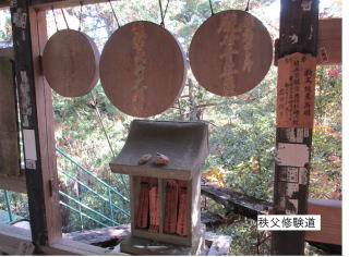 巨岩の横の歩き難い道を登ると、東屋の様な造りの修験道に着く。中央に厚目の円盤が縦に回転するように設置されていて、円周側面に南無阿弥陀仏と書かれている。これを廻しながら祈願するようだ。ここの木板に影森は武甲山の陰になっていると書かれていて、高尾山北側の日影と同じだと思った。