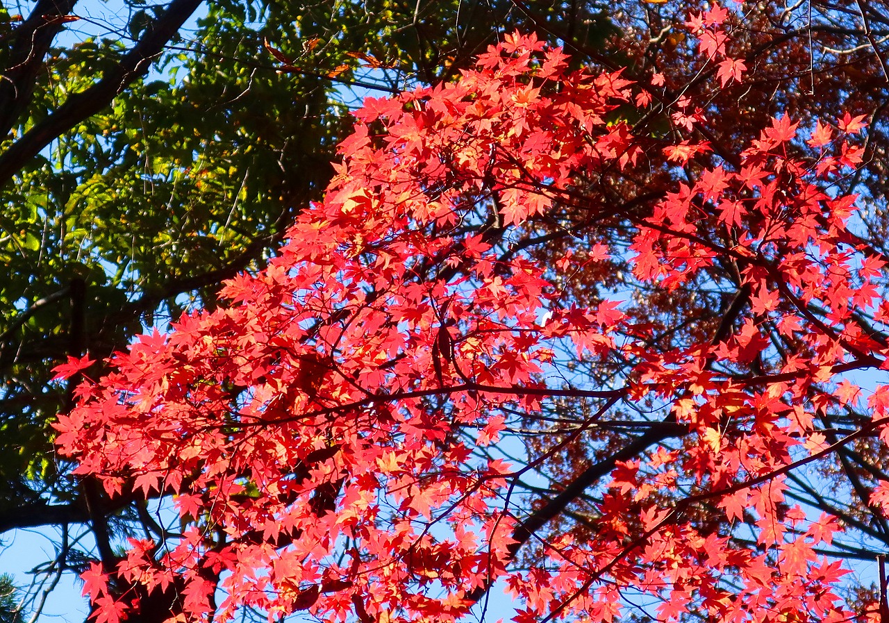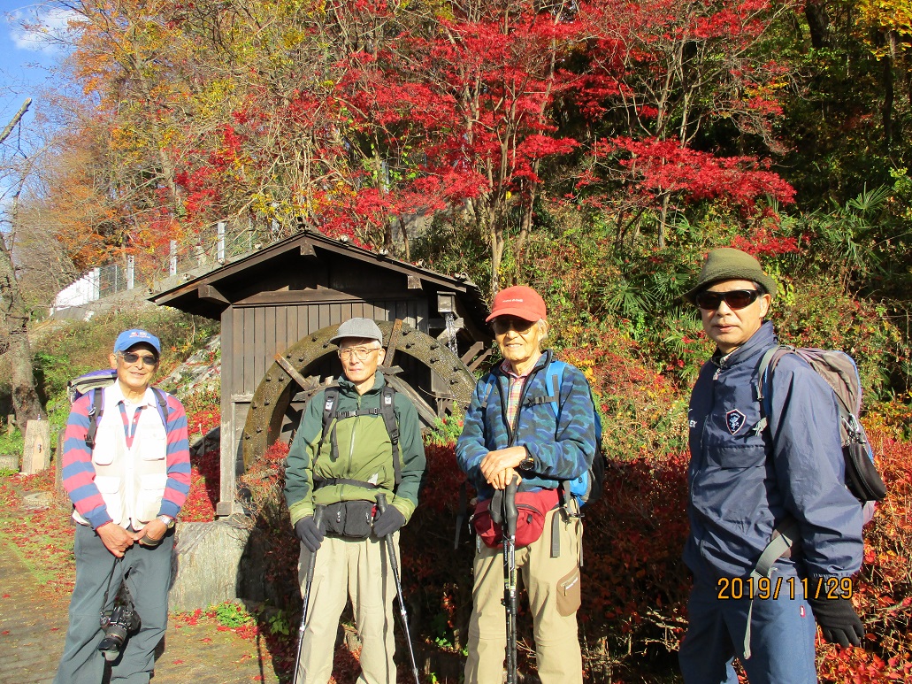 | 昨日まで降り続いた雨がうそのように上がり絶好のハイキング日和となった秩父路を歩き、護国観音、岩井堂などの史跡、両神山、二子山の山並み、武甲山の山容、赤や黄色に染められた紅葉、を満喫した。 | |||