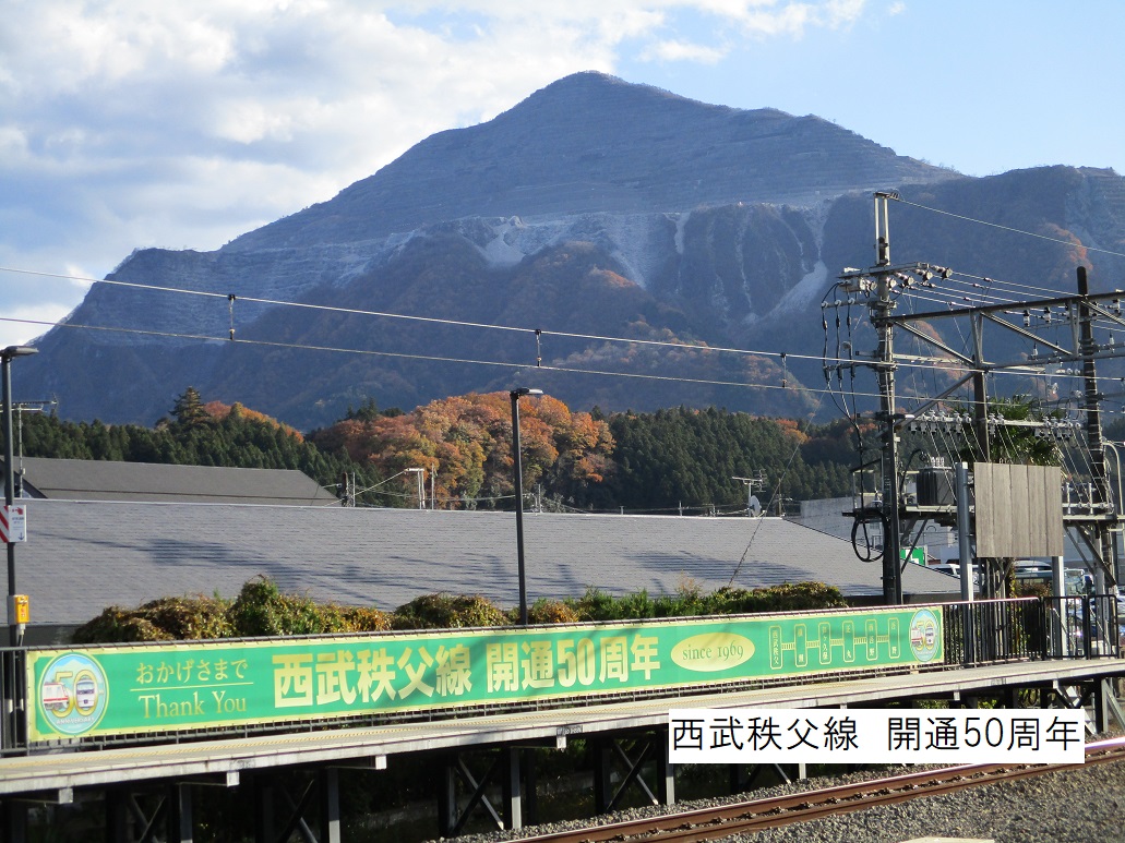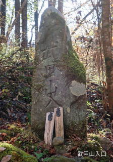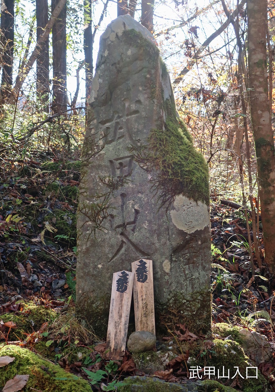 この先の下り道では紅葉が映えていて美しい。大山祗神の横を通って下り、登り返すと三角点がある398.8mピークに着く。少々長く感じる下りを終えると沢沿いの道になり、小橋を渡ると「武甲山入口」と彫られた石柱の前に出る。武甲山は、石灰石採掘前は北面から登れた。北面のコースは西武秩父駅から歩いて登れるので一般的だったと思う。しかし、今は採掘により山容が大きく変わり、昔の面影は全くない。約60年前に友人と北面から武甲山に登ったときの写真が残っていて、道標に「ウノ岩尾根」、「屏風岩を経て上丸山」と書かれているが、今ではその場所が分からない。