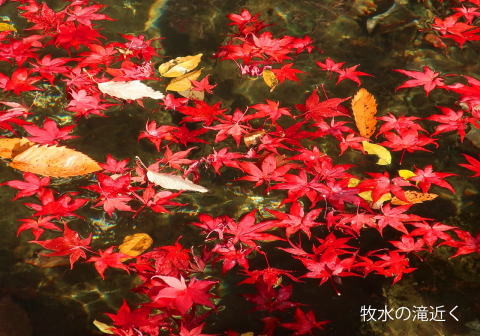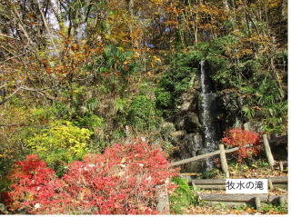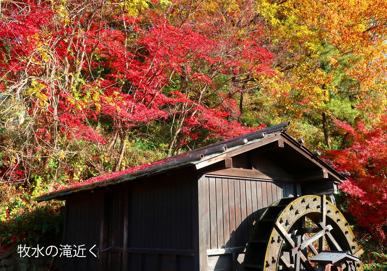 平坦な道を進んでから僅かに登ると、羊山公園に着く。芝桜の季節でないので閑散としている。舗装道を緩く下り、西武秩父駅に向かって左折してから右の小道を下ると、歌人・若山牧水の歌碑がある小公園に着く。周囲の紅葉が盛りで美しく、小池に浮かぶ紅葉の葉も絵になる。ここには人口の小滝や水車小屋もある。
