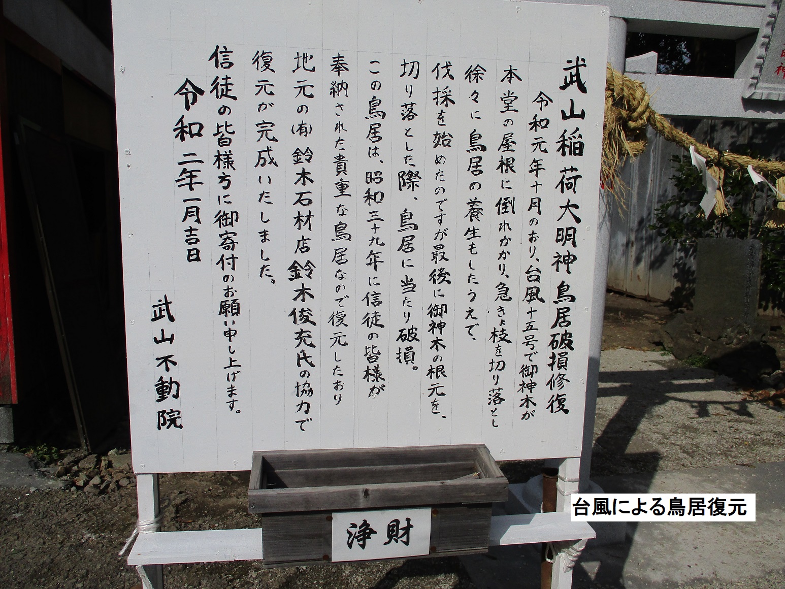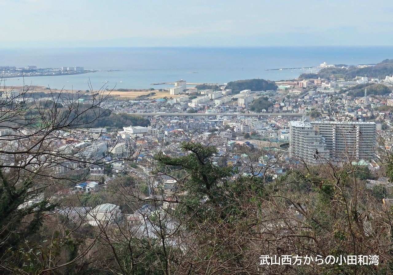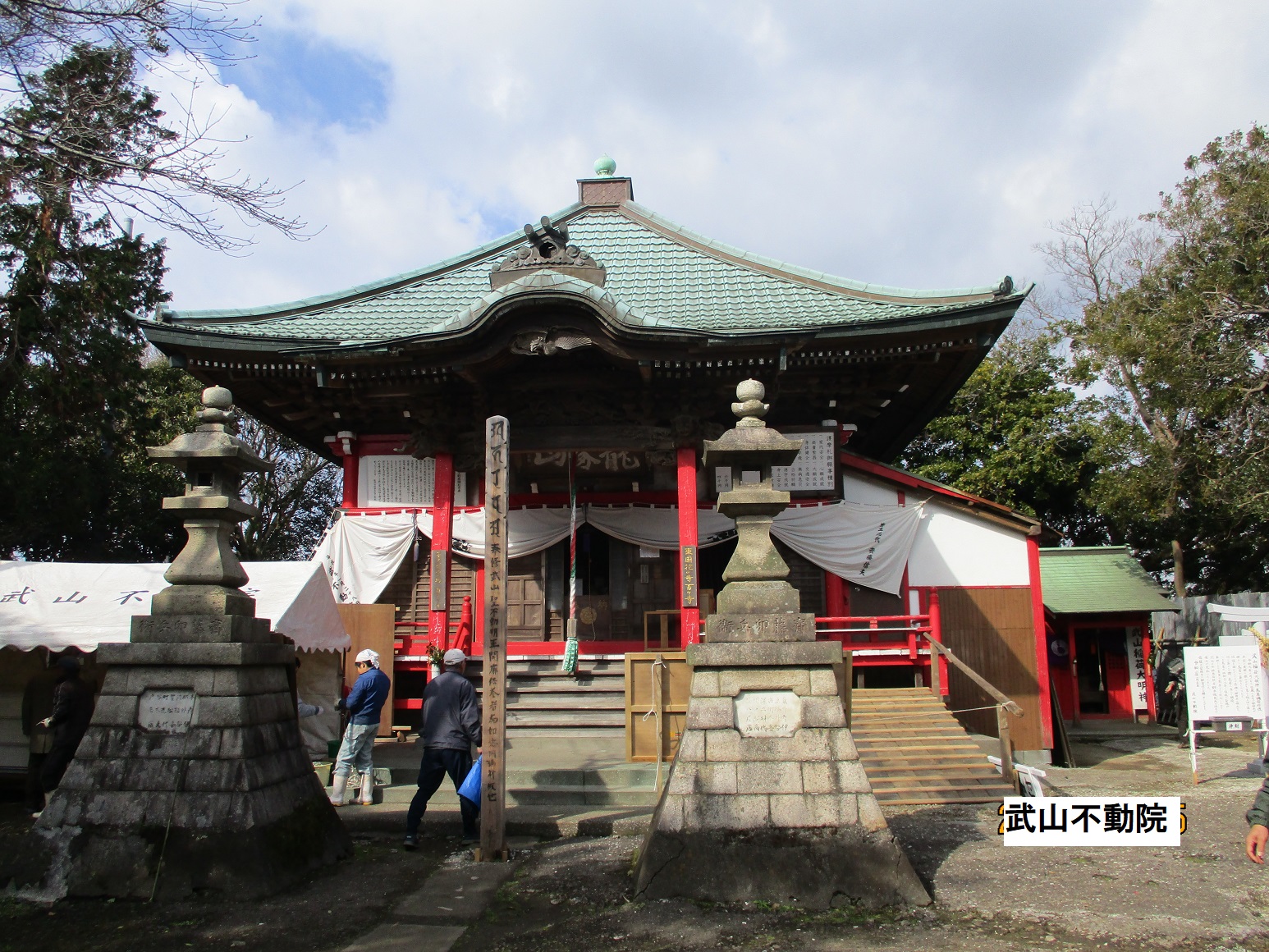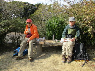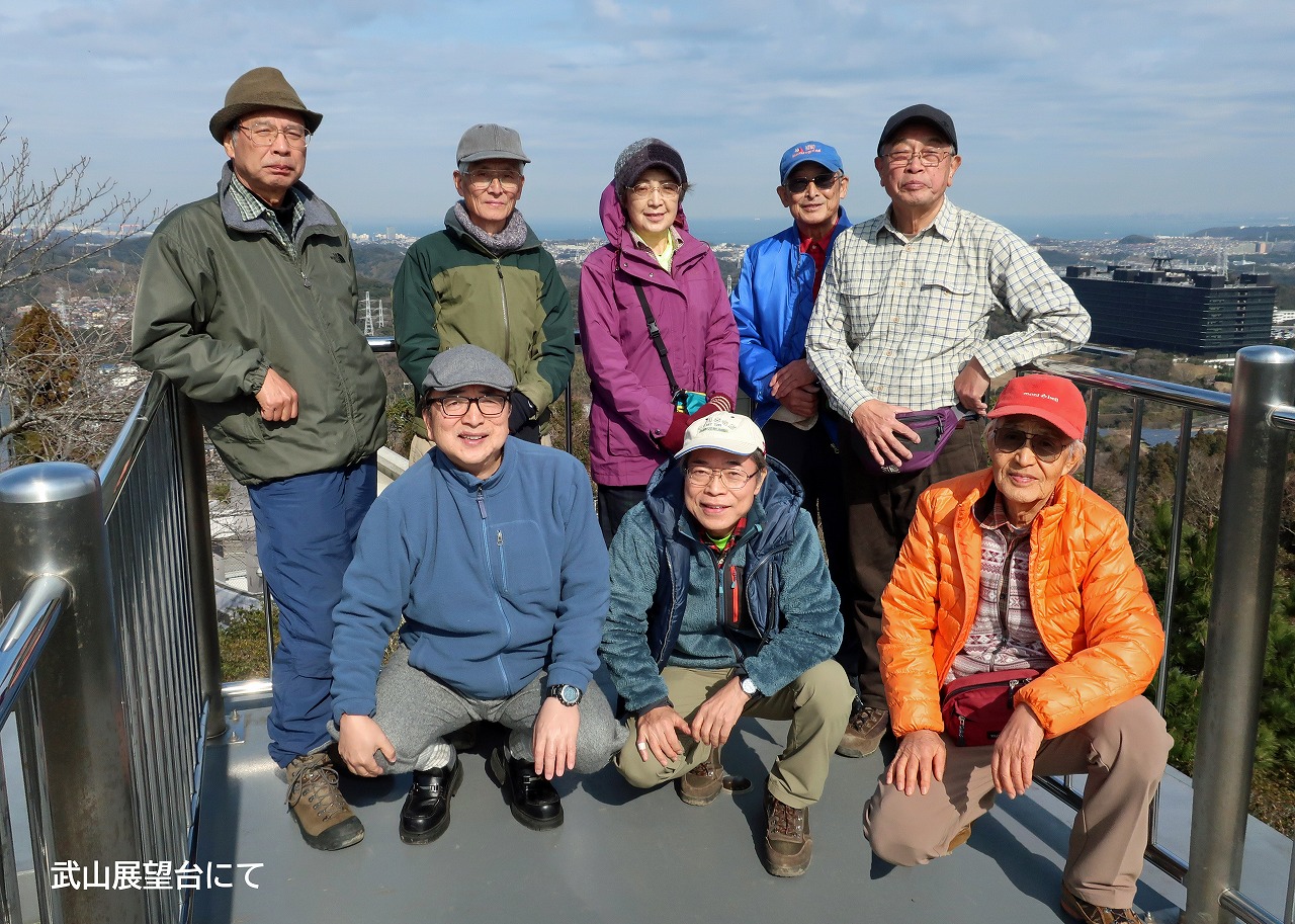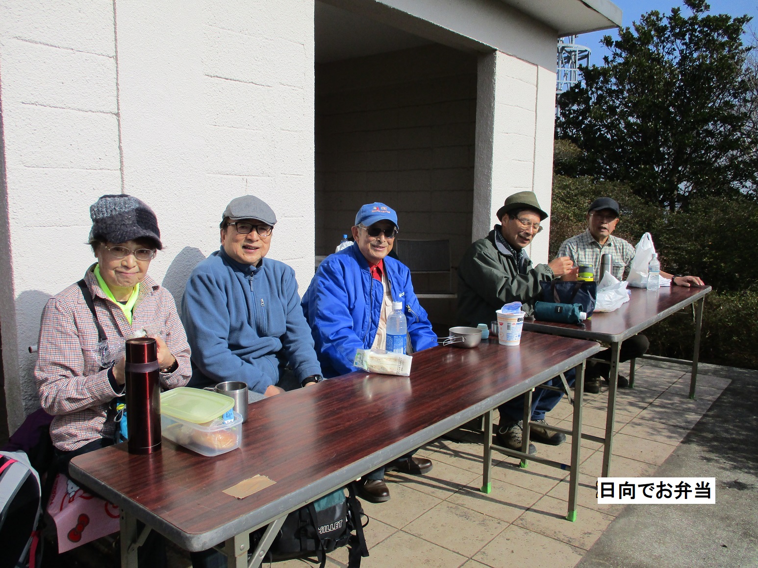 余裕な歩き方で武山不動尊に到着した。1月28日が初不動とあり、地元の氏子さん達が祀りの準備をしていた。お参りをしてすぐ横の武山山頂に到着した。ここで昼食にする。山頂は北風を受けて寒かったが、南側は薄日が差して暖かい。展望台の下には既に10人位のハイカーが陣取っていた。展望台下から長机、長椅子を持ち出して、暖かい陽を浴び一線に並んで食べた。