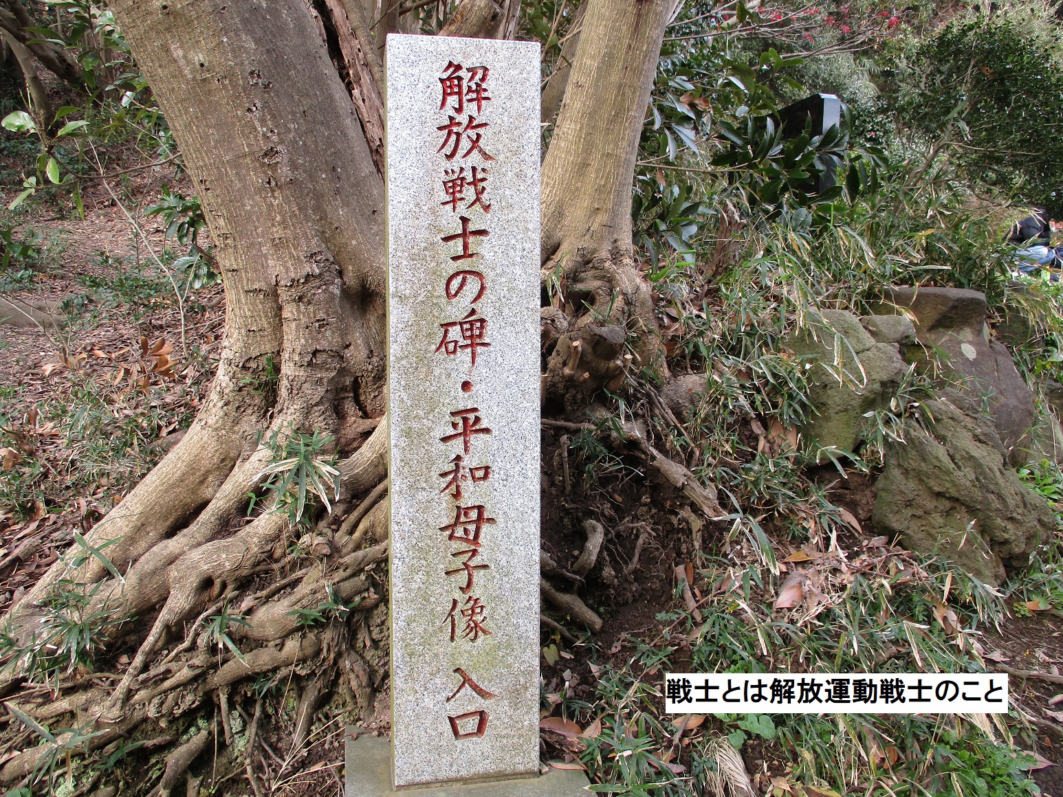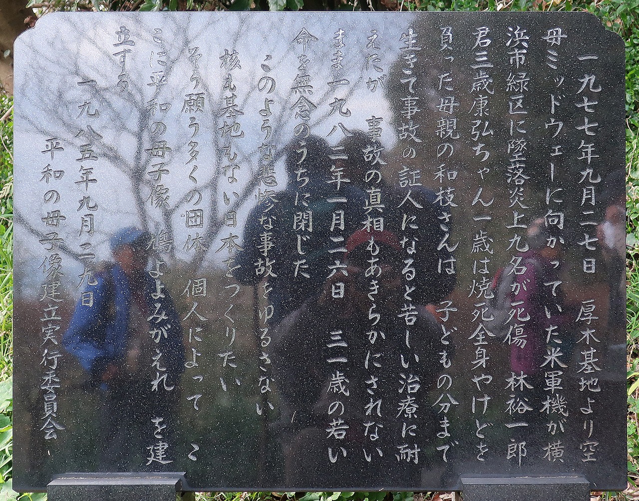 京急長沢駅への下山道を確認し降りた。かなりの急坂で滑りやすい。ストックで調整しながら慎重に歩いた。山行もそろそろ終わりに近い場所に平和の母子像の記念碑があった。米軍機の墜落炎上で九名が亡くなり、その中に3歳と1歳の幼子もいた。後にその母も亡くなり、やり場の深い悲しみと米国への憤りを強く思い、平和を願い有志の方々が建立された。