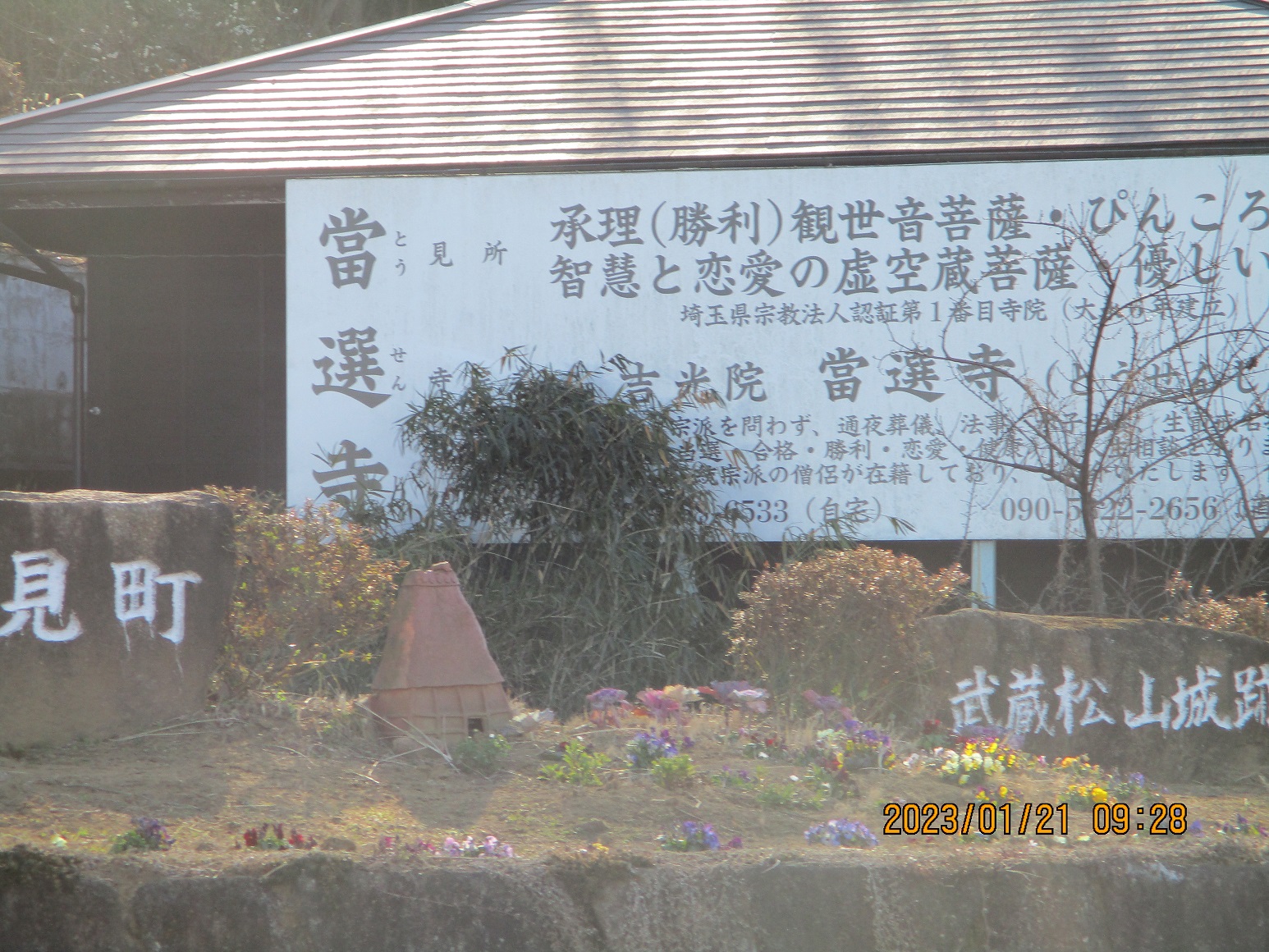 歩き始めて5分ほどに「武蔵松山城跡」の看板が目についた。ここには寄らずに通り過ぎたが調べるとここは「比企城館跡群」という名称で奥には本丸跡などもあり、国の史跡があるようだ。