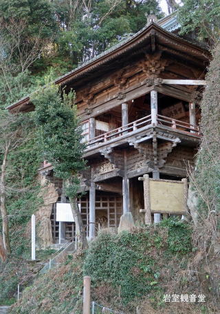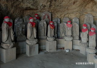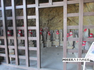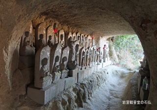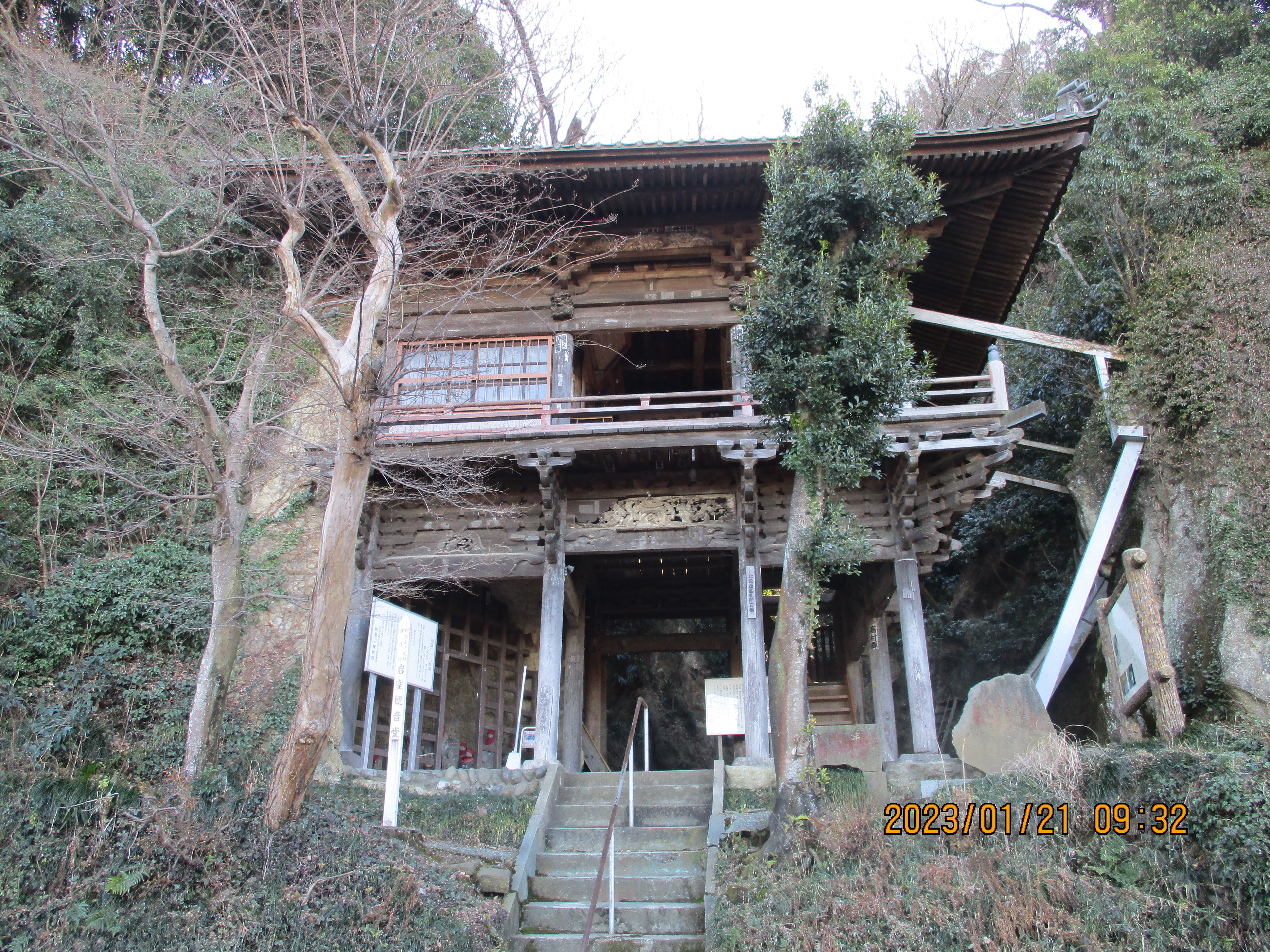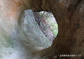 9:35 「岩窟ホテル」のすぐ隣に岩室観音が岩山に挟まれるように建っている。ここには四国巡礼88か所の礼所が2か所に分かれて石仏として安置されていた。建物の裏の岩山の斜面には鎖場があり、ここを登ると胎内めぐりができる。安産と願い事が叶うとあって我々メンバーも挑戦した。この建物は大きくはないが岩山の地形をうまく取り入れて造られている。江戸時代の寛文年間(17世紀後半)に再建されたそうだが歴史を感じさせてくれる。