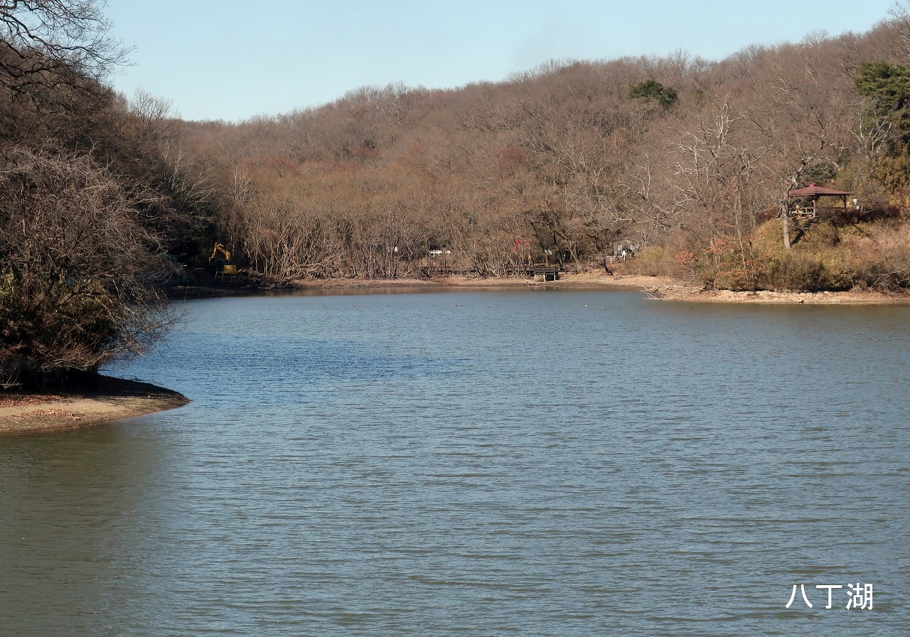 吉見観音から5分ほど坂を登ると左側に急に八丁湖が見え始めた。そして右側にはこれまた広い田畑が続いている。なるほど八丁湖が農業用水としての溜池であることが理解できた。湖の一周1600mもある周辺には公園が整備されていて、遊歩道も完備、格好のウォーキングやランニングコースになっている。湖面にはこの時期なのに多くの鳥たちが泳いでいた。遊歩道の柵にはカワセミも含め40種類もの写真付きの鳥の紹介看板がかかっていた。