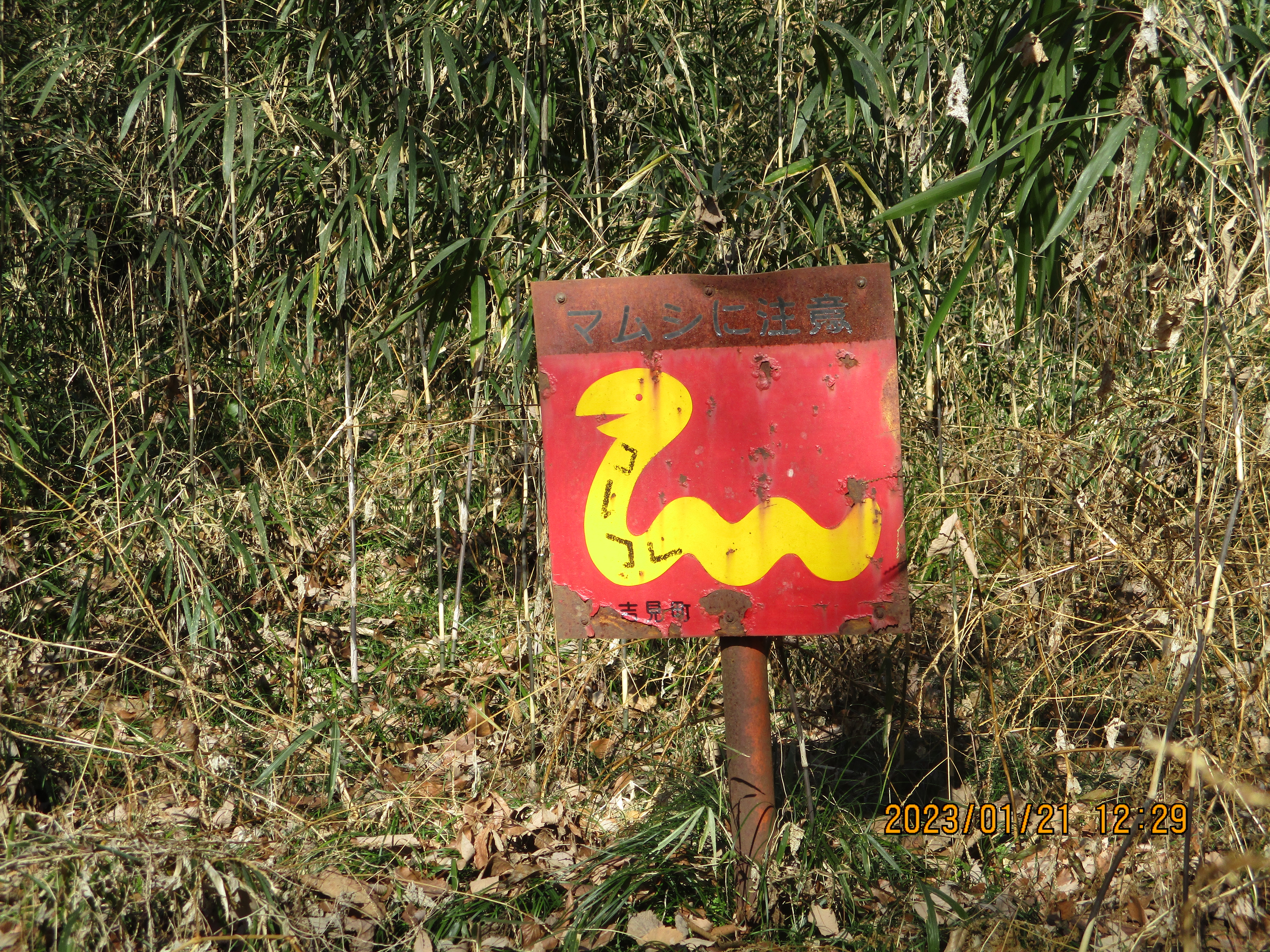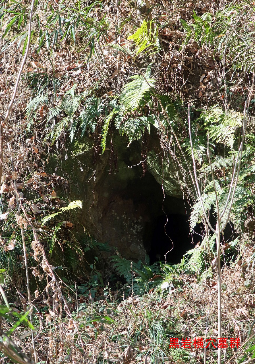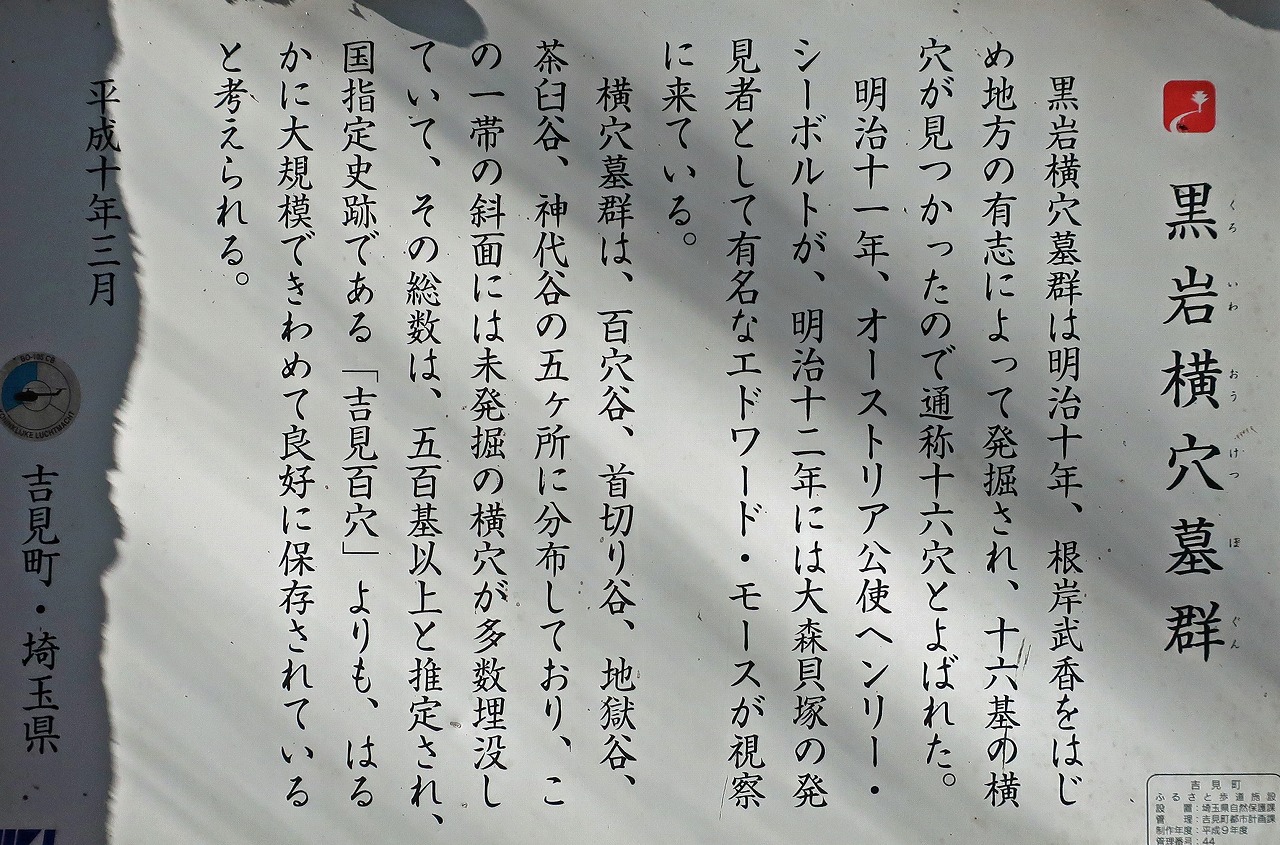 12:20食事後歩き出すと八丁湖公園の北側に「黒岩横穴群」と書かれた看板があり、またもや横穴式の集合墳墓が遊歩道からは見え出した。吉見百穴よりも穴が大きく、まわりが木や雑草で覆われている。こちらは未発掘の墓穴が多く500基以上あると文献にあった。またマムシ注意の看板もあり不気味な感じがする。土地活用に対し保存と開発の間で板挟みされた自治体の苦悩が垣間見えた。