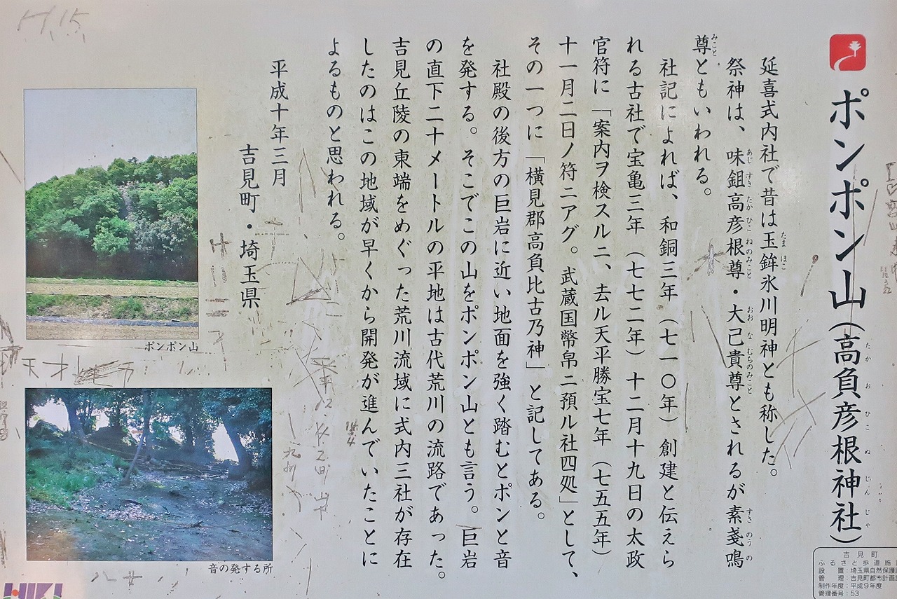 13:00公園を出て舗装路を歩いていくと高負彦根神社に到着。ここも創建和銅3年(710年)と歴史がある。そしてこの裏山がポンポン山だ。山の由来が「巨岩に近い地面を強く踏むとポンと音を発する」と境内の案内板に書かれている。皆でそれはどこだとあちこちでジャンプしたが納得いく音までには至らなかったようだ。
