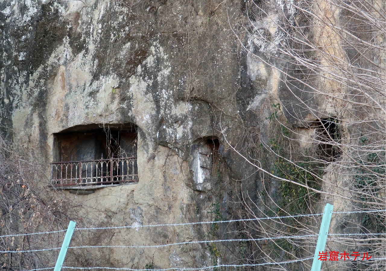 さらに5分ほど行くと「岩窟ホテル」という謎めいた窓付きの大きな岩肌が見えた。農家の人が1904年から20年かけて彫って作ったそうで実際にホテルとして使われたかも不明、一説には岩窟彫ったが岩窟ホテルに訛ったのではと言われている。