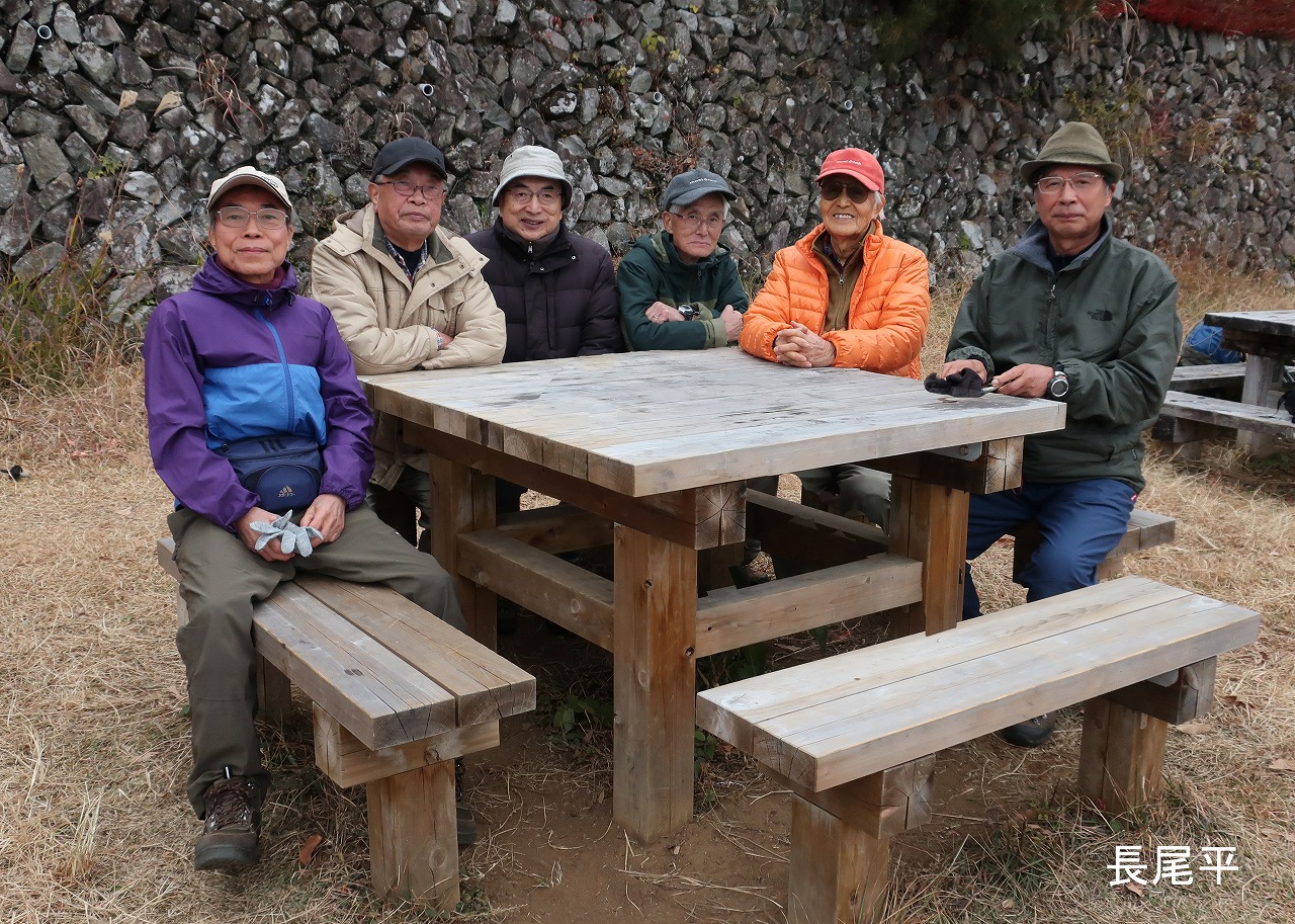 入口に建つ長谷川恒男記念碑に黙祷し、忘年会食を行う最南端の展望台に向かった。長尾平園地やヘリポートの周辺にも人の姿が全く見られない。予定していた場所に着くと木柱製のテーブルと腰掛けがいつものように3セット設置されていた。誰も居られないので、贅沢なことに2セットを占有させてもらった。(10:05)。