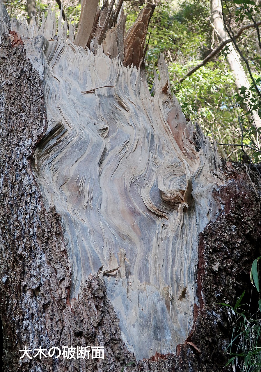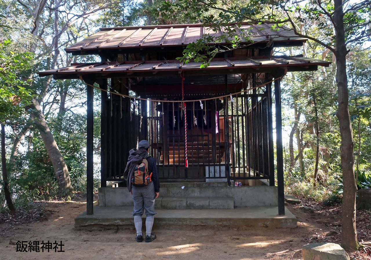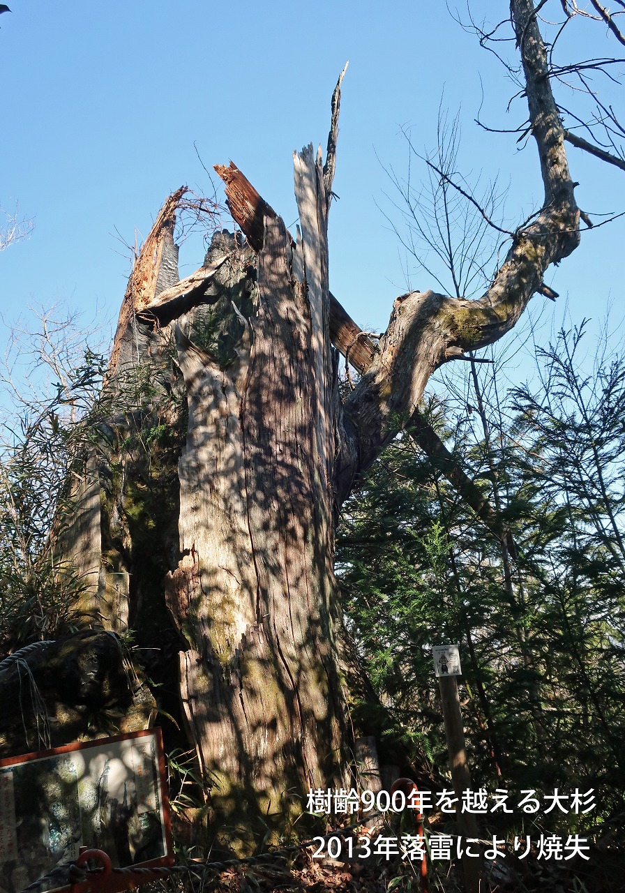 右に東屋を見て進むと登山口に着いた。猪出没注意の表示があるが、今や猪はどこにでもいるようだ。ここから登山道になり、少し先で女坂との分岐に出た。この後は今回最も急な尾根道の男坂になる。登りきると4方向に分かれた四ッ辻で東方に進む。僅かに登ると飯縄神社に着いた。ここから下ってもよいが、登った道を引き換えし、途中で右に細い道に入った。幹が4〜5m上で裂けた御神木の大杉が立っていて、樹齢900年を超えていて2013年に落雷で焼失したとのこと。その先には小さな宝ヶ池があり、枯れることがないとのこと。鷹打場方面を左に見て少し登ると、狼煙台跡と思われる北方が開けた所に出て、大室山、蛭ヶ岳、丹沢山等の丹沢山塊がよく見えた。陽が当たり、ベンチがあるので大休止したい所だ。その少し先で飯縄神社に戻り、結局飯縄神社が山頂に建つ小ピークの周りを時計方向に1周したことになる。