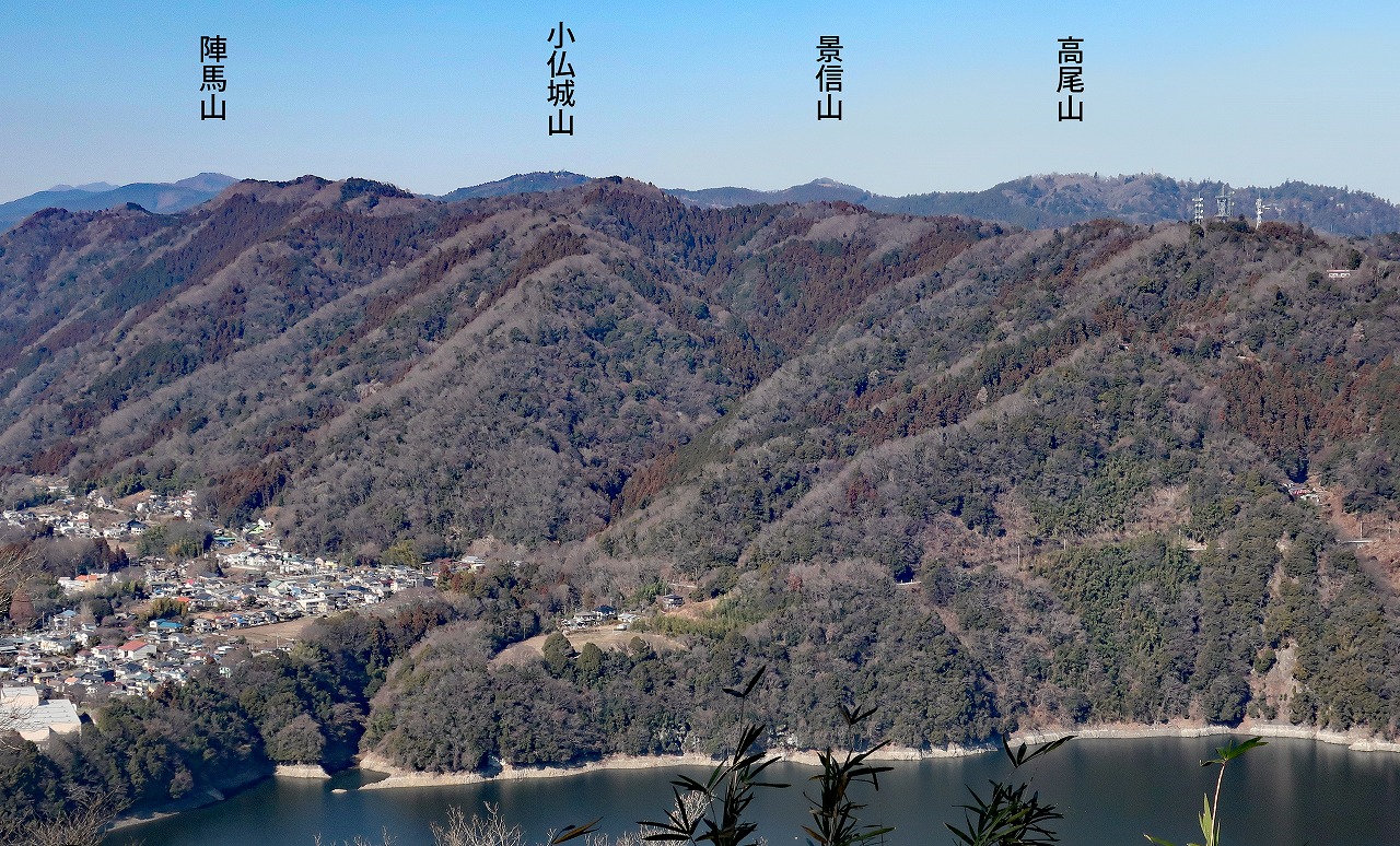 ここから見ると正面の南高尾山稜の後方に高尾山、小仏城山、景信山の山頂だけが突出している。なお、高尾山から小仏城山までの尾根はほぼ東西方向に延びているが、小仏城山から景信山までの尾根はほぼ南北方向に延びているため、高尾山と小仏城山の間に景信山が見え、高尾山からの距離は小仏城山より景信山の方が近いように錯覚する。また、遊園地があるプレジャーフォレストも視認できる。持参したカシミールのパノラマ図で陣馬山、権現山、扇山、大菩薩連嶺から小金沢連嶺等を山座同定でき、石老山の尾根の横に見える鋭角の滝子山も確認できた。中央線沿線の山は車窓から見ることが多く、南からの形が記憶に残っている。しかし、津久井城山からだと西北西の方向から見ることになり、形状や位置が大きく変わって戸惑った反面、新鮮な感じがした。