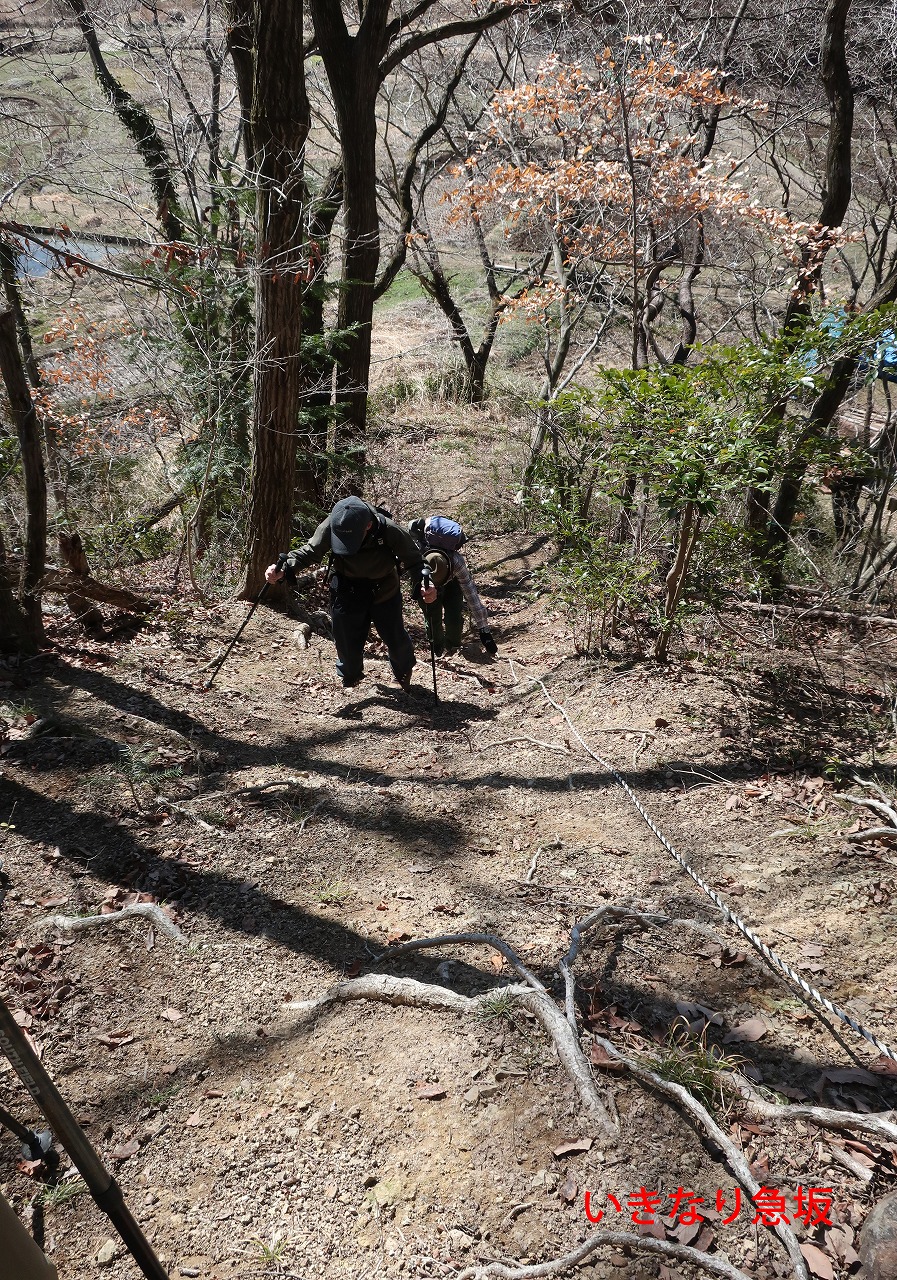 横沢入からすぐに急登の山道となる。急登であるうえに地面がぬかっていて滑りやすい。