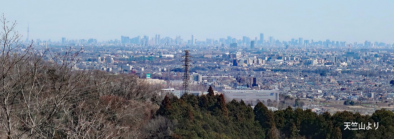 昼食後、大久野分岐から南下して20分余りで天竺山(310m)に到達する。山頂付近に三内神社の本社がある。山頂からは南側が開けていて、サマーランドや新宿の高層ビル、スカイツリーなどが見える。ここで記念写真を撮る。