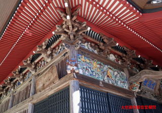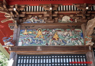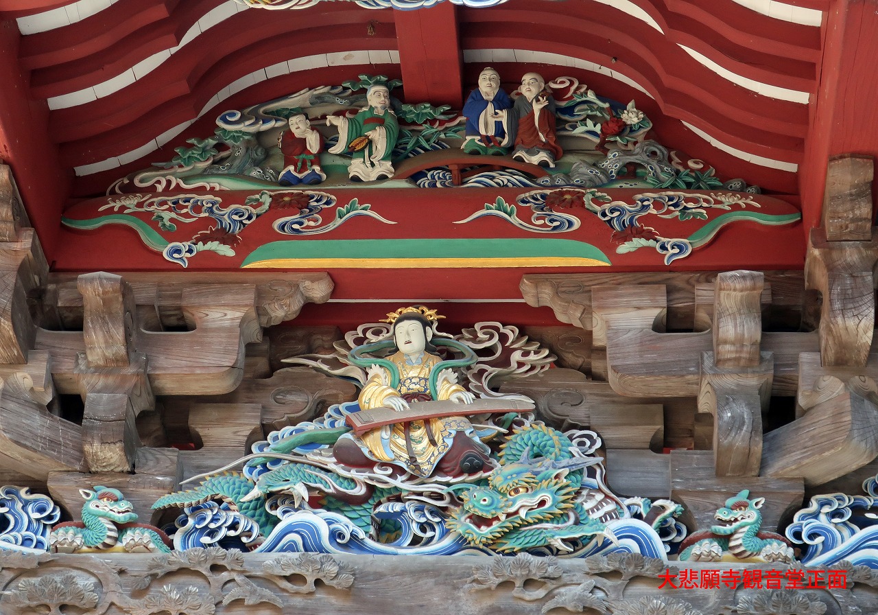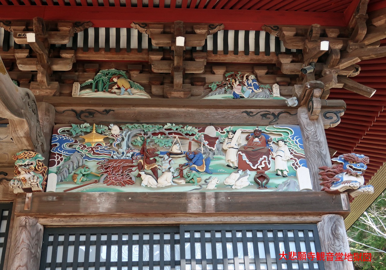 車道に面して長屋門があり、その先に風格のある仁王門がある。仁王門の網目から中を覗くと逞しい仁王像が見えた。仁王門から中に入ると正面に観音堂があり、極彩色の彫り物が目についた。その右手に大悲願寺の本堂があり、中から一人の僧侶が出てきた。創建の年代を尋ねると1191年と西暦で教えてくれ、更に白萩の咲く場所も教えてくれた。大悲願寺は政宗が訪ねてきて白萩を所望したという「白萩の寺」として有名なお寺らしい。境内には四国八十八か所のお遍路道を模したミニ遍路道があり、そのそれぞれに仏像と経文の立て札とが設置されていた。