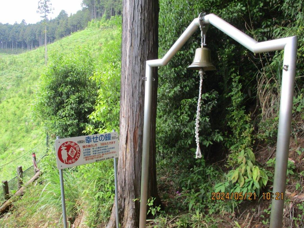 社殿を過ぎると四国礼所を示す標識が出始める。ここのゴールが88番礼所でそこが展望台になっていた。名称も88展望台、幸せの鐘まで付いている。1つ鳴らすと自分のため2つ鳴らすと大切な人のため3つ鳴らすとみんなのために幸せが来ると書かれていた。3つ鳴らして幸せを願った。ここからの眺めもよく、空にはトンビが森蔭からは鶯の鳴き声がおおきく響き渡ってきこえた。