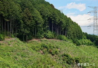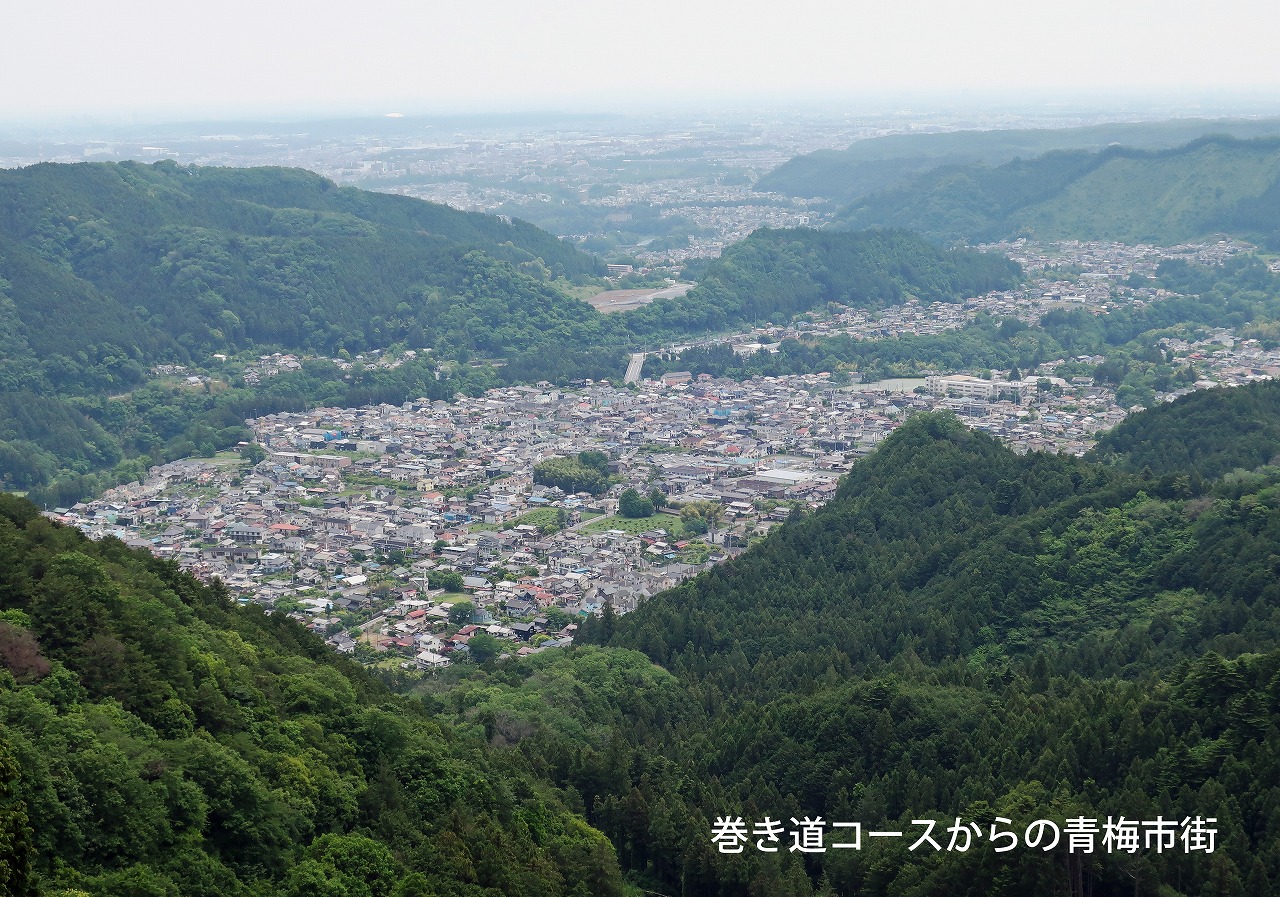 我々はこれから愛宕山に向かうが眺望のきく巻き道を通ることになる。眺望のきく山道を歩くのは気持ちが良い。真下に見える青梅市街、遠くに光る西武球場のドームの屋根、うすく霞んでいるのは新宿の高層ビル街か。巻き道は狭く、左側は絶壁だがあたかも登山者の滑落防止のような柵が長く続いている。これは隣の植樹地帯へ鹿が入り込めなくした防止柵だ。「鹿が柵にかかったときには危険なので近寄らないで下さい」の看板を多く見た。