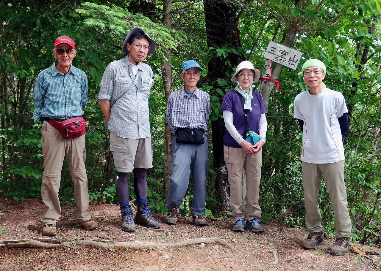 ここからは一気に三室山に向かう。30分ほどして今日の目的地三室山(646m)に到着。ここで昼食となる。前回の物見山しかり、山頂でありながら360度視界がない。しかし今日の山行はここまでの巻き道歩きで眺望を楽しんで来たのでさほど抵抗はない。食事中の話題はやはり大谷翔平、国内に明るいニュースがないだけに彼の活躍は突出しているのだろう。同じ時期に生きた喜びを感じたい。彼の活躍をNHKが取り上げ過ぎではないかとの意見もメンバーにはあった。