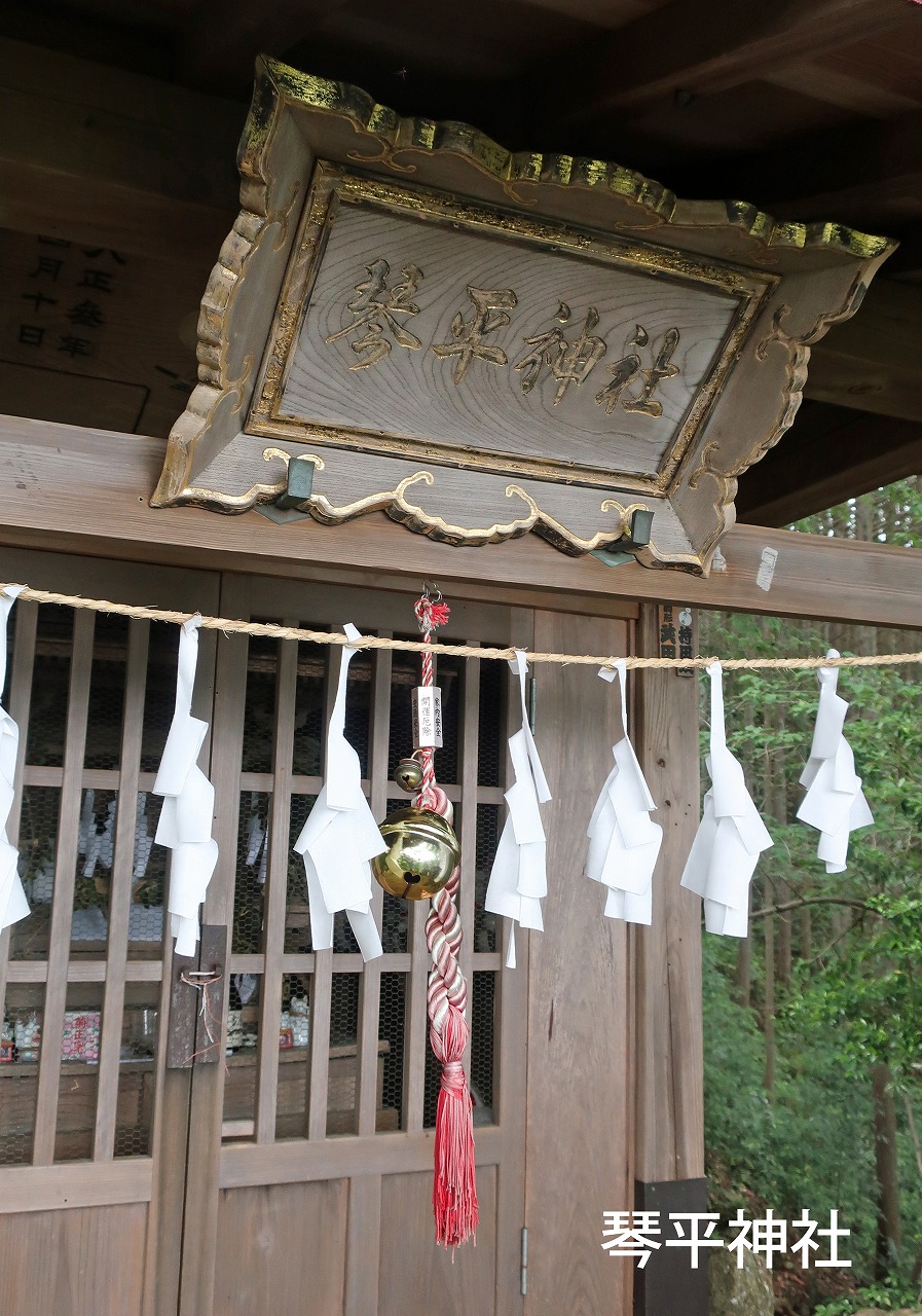 食事タイム40分後の12:25に歩き出す。ここからは下山路、25分ほど歩いて琴平神社到着、ここの解説板を見るとかつては金比羅大権現といい明治3年に現在の名称に改められたとある。寛政9年(1792年)創建。ここからの眺めも気持ちが良かった。