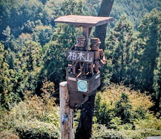 | フェンス尾根コースを奮闘して登った山頂。晴れた空に北東から南西に眺望が広がっていて、遠くのビル・塔、丹沢・奥多摩山系の山々、少し雲に隠れた富士山がよく見えた。あちらこちらに設置された素朴な木造り人形に歓迎されているようでした。 | |||