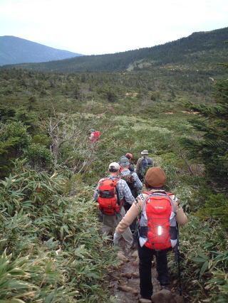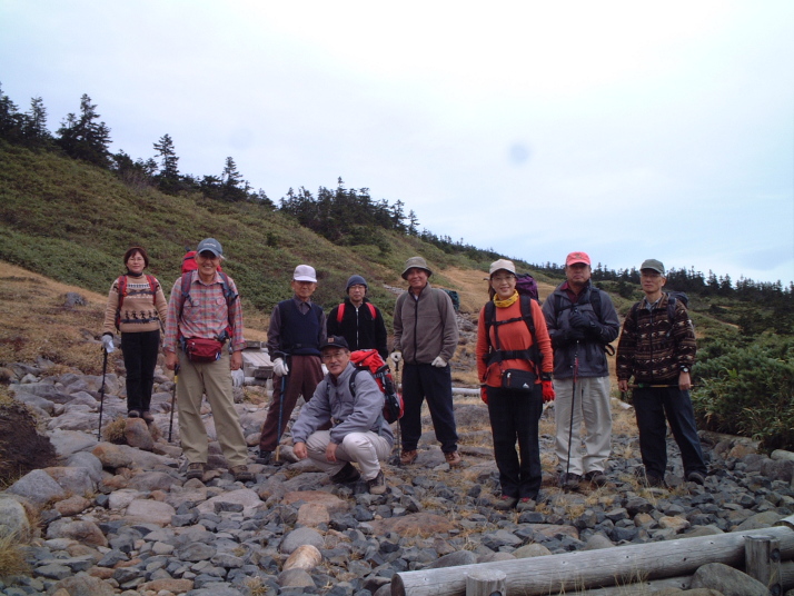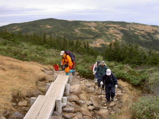 錦秋の山麓に初冬の稜線。快適な木道。悪路の下りは時間との戦い。裏磐梯国民宿舎泊。翌日は磐梯山登山組と観光組に分かれ、登山組は風雨のために中の湯から下山。
