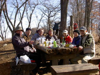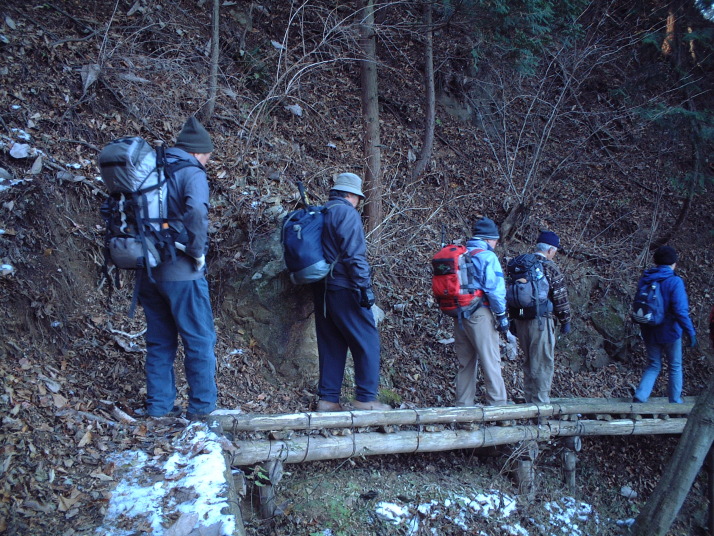 忘年山行。遅刻者がいたが、予定の時間より早く山頂に着く。山頂でシチューを作る。数馬の湯で暖まった後、投票で会の名を決定した。