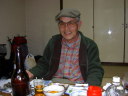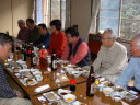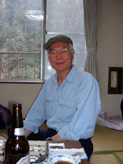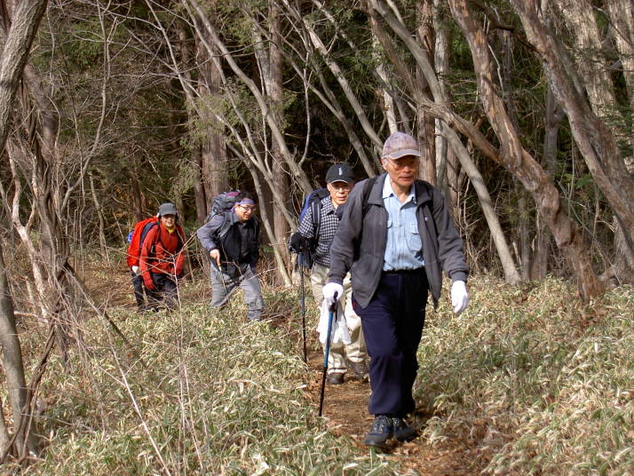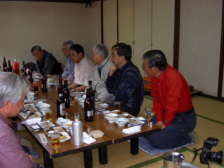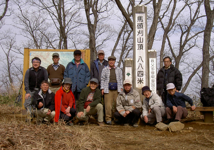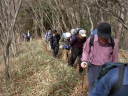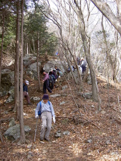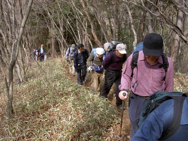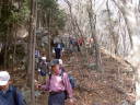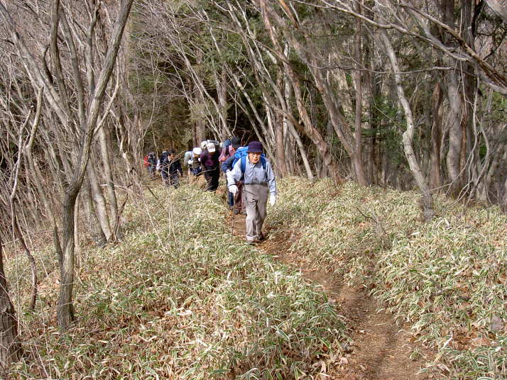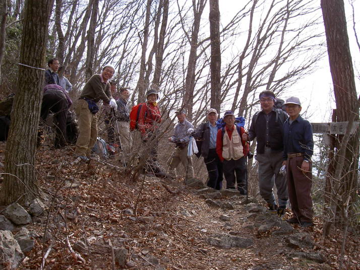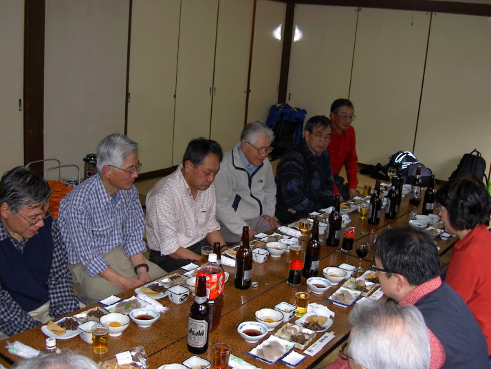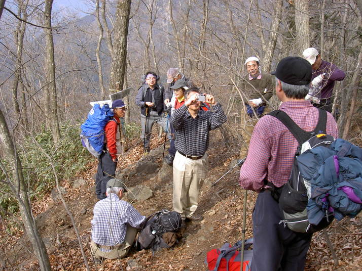 千足尾根は急坂。厳冬期なのに全く積雪なし。光明山荘で鈴木さんの御苦労山会を行う。