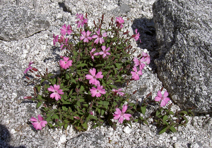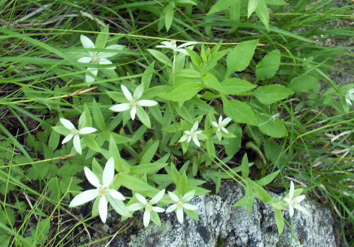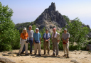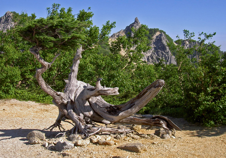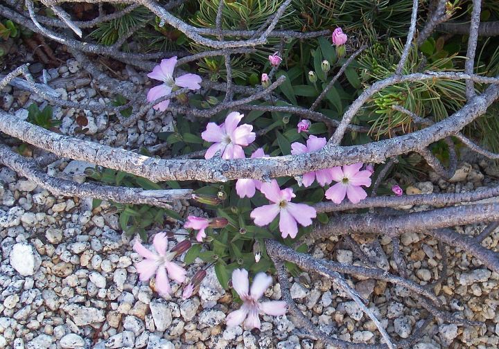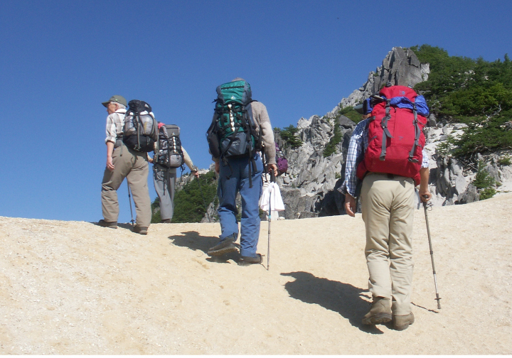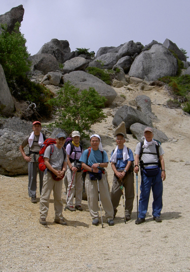 28日 薬師岳から雲のない白根三山を仰ぐ。南アでは山久会として初めての好天。観音岳からアカヌケ沢の頭までは甲斐駒や地蔵岳のオベリスクを見ながら歩く。また、砂礫に可憐に咲くタカネビランジに感激。高嶺から白鳳峠経由で広河原に下る道は1,250mの標高差の下りで、かなりの急勾配であって、いやになるほど長い。