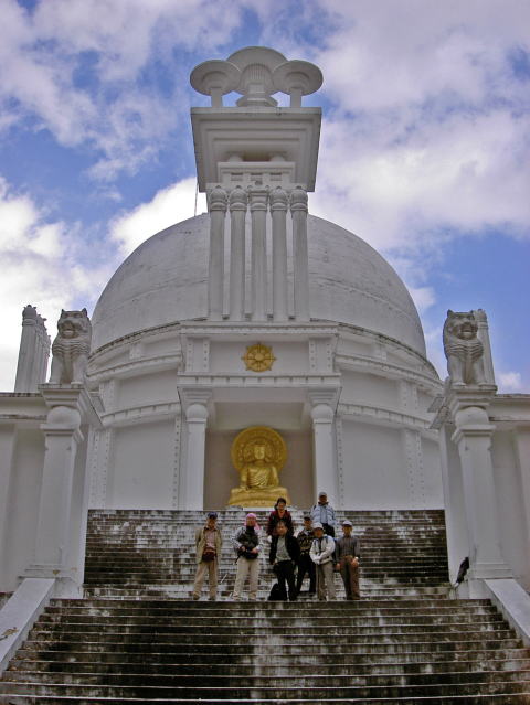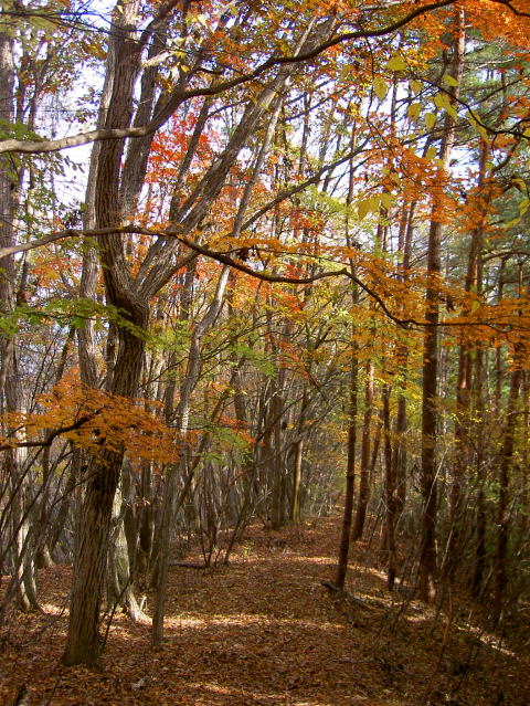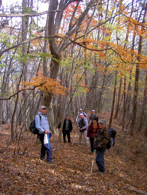 川久保からの林道の途中に大丹波峠への道標があるが、廃道のようなので、峠まで林道を辿る。北西に張り出す主尾根に上がるまではジグザグの道。カラマツの落ち葉を踏んで登る。尾根は緩い登りで、簡単に鹿倉山に着く。今日は大菩薩方面の展望が効かない。昼食後は、だらだらと下って、大寺山に着く。この地に巨大な仏舎利塔とは誰もが違和感も持つ。また、廃墟の様で、静まりかえっていて薄気味悪い。ここから急坂を下り、深山橋BSからバスに乗る。
