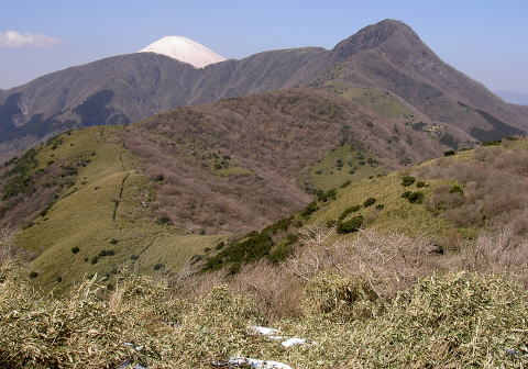 矢倉沢峠までは未だ雪が固く滑り易い。峠から登る途中で振り返れば、箱根外輪山最高峰の金時山が鋭く聳えている。猪鼻山と言う別称もむべなるかな。登るにつれて金時山の左に頭を出している富士が次第に大きくなる。最初のピークを越えてから箱根竹が密集している道を進む。竹が雪の重みでしなり、先端が凍った雪にへばり付いてトンネルの様になった所がいくつもある。しゃがんだり、腹這いになったりして潜らなければならないので、疲れる。