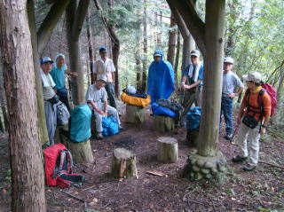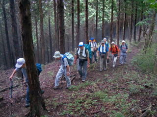 上野原からのバスは団体で混んでいたが、彼らは立野峠に向かい、二十六夜山へは我々のみ。予報に反して早々と小雨になった。短い距離の鉄砲登りが3回ある。快晴ならば南アを望むことができる露岩では展望ゼロ。日曜日なのに終日他のパーティに全く合わず、静かな山行だった。
