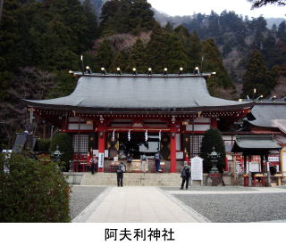 バス停から多種の独楽がある土産物店と豆腐料理の店が立ち並ぶ整備された石段を登る。その先から男坂を登るが、こちらの石段は段差がある上に不揃いで歩き難い。曇空だが阿夫利神社では相模湾に浮かぶ江ノ島が見えた。山頂に近づくにつれ小雪が舞い、山頂での昼食時には手が冷たくなった。