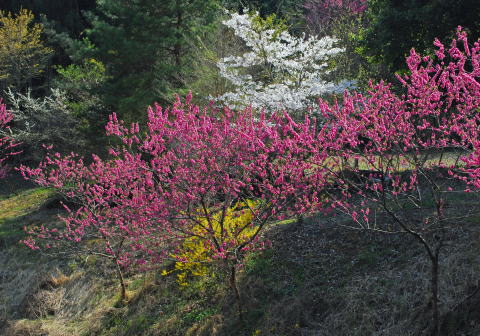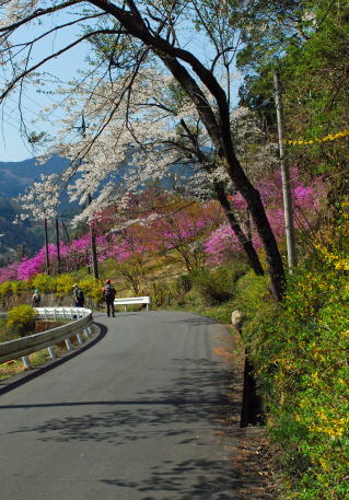 剣ヶ峰を越えて白石峠から下山。この途中でもカタクリが咲いていた。白石 車庫BSに向かう舗装道に下ると、花盛りの桜、桃、レンギョウが色を競い合い、ミツバツツジやコブシも加わって百花繚乱の様であった。