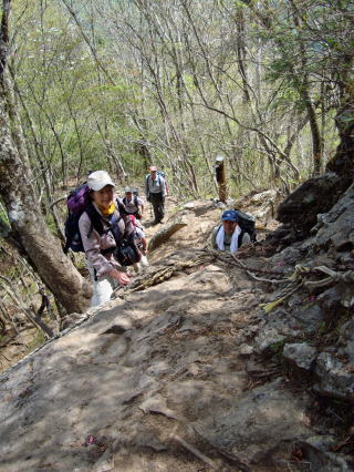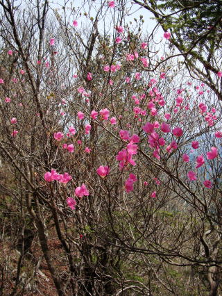 15日は木村氏が車で来るのを待って出発。道は薄川を左岸や右岸に渡り返して斜面の道を進む。薄川から離れると急坂になり、ニリンソウが多数咲いている。清滝小屋からも鈴ヶ坂という急坂で、数カ所の岩場を鎖で乗り越える。山頂間近では待望のアカヤシオに歓声を挙げる。平日なのに狭い山頂はハイカーで一杯。好天のため大展望で、八ヶ岳の右には北アの白い連峰を望むことができた。