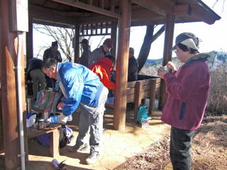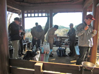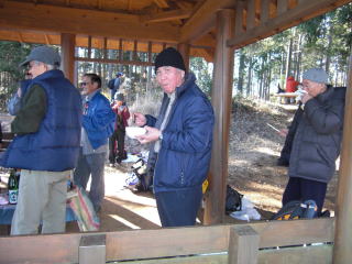 概要: 忘年山行。Aコースは稲荷山コース、Bコースはケーブルで登り、高尾山山頂で合流。一丁平の少し手前の東屋で、おでんを暖め、飲みながら談笑する。1時間後に各自が今年の山行の想い出を披露し、その後に各自が持ち寄った約500円の品を抽選でプレゼントとする。城山から千良木に下った後、5人はタクシーで相模湖駅経由で先に帰り、9人は弁天橋経由で相模湖大橋まで歩いた後、タクシーでやまなみ温泉に行く。