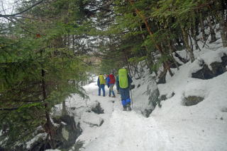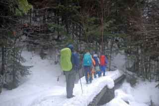 渋ノ湯から、迎えに来てくれた高見石小屋の今村氏に従って登る。渋川右岸に出てから雨になる。賽の河原に出ると、風が吹き付けるが、背後からなので助かる。樹林帯に入ると、積雪量は1m位で、ときどき足がずぼりと潜る。高見石小屋で遅い昼食。