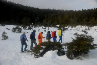 今村氏の先導でスノーシューを履いて昨日登った道を下る。白駒の奥庭では露岩が点在し、意外にも陽が当たってきたので気分が良い。麦草ヒュッテの近辺ではトレールのない所を歩くと、膝まで潜って苦労する。積雪は多い所で2m位か。雪道の国道を歩き、白駒池駐車場経由で朝に下った道を登り、高見石小屋に戻る。