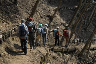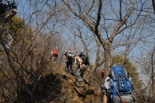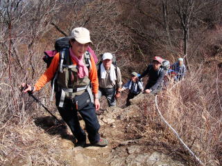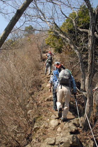 半僧坊の山門は巨大である。沢添いに登り、尾根に上がると風が強い。経ヶ岳では晴れているのだが、黄砂のためか大山さえ見えない。急坂を半原越の林道に下り、登り返す。この辺りは木段で歩きにくい。リッチランド分岐で昼食にしたが、ここも風が当たる。この後も部分的に急登がある。やせ尾根は要所に太いロープが張ってあるので、心配はない。吹きさらしの場所で強風を覚悟していたが、意外に収まってきた。仏果山では高い展望台に上る。
