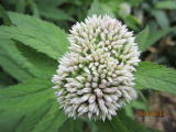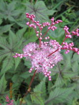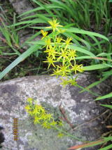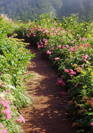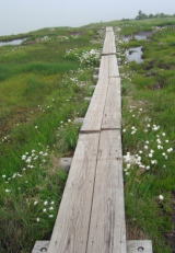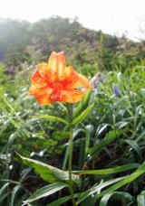この先は、多少歩き易くなるが、霧によって次第に視界が悪くなる。小松原分岐に着いたときには、小雨になり、ザックカバーを付け傘を差すが、直ぐに止む。股スリ岩を通過し、緩く登って行くと、ドラゴンドラ方面への道があるが、雑草が茂り、あまり歩かれていない。その先に神楽ヶ峰八合目の道標がある。視界が効かないので、未だ神楽ヶ峰への登りがあるのかと思ったが、道は緩く下るので、何か間違えているかと気になった。そのうち、雷清水に着き、冷たい水で喉を潤す。鞍部に下ると、ウスユキソウ、タカネナデシコ、シラネアオイ、ミヤマシャジン、シモツケソウ、クルマユリ、コバイケイソウ等が咲いていて、御花畑となっている。緩いアップダウンの道を過ぎると、かなりの急登になる。息を切らして約00mの高度差を登り切ると山頂湿原で、木道の平坦な道を歩く。先方に2軒の小屋が見える。心配していた雷雨に遭わず、ワタスゲが揺れる池塘を見ながらのんびり歩く。廃屋になった遊仙閣の裏が苗場山の山頂だ。一角にニッコウキスゲが咲いている。