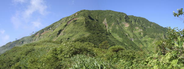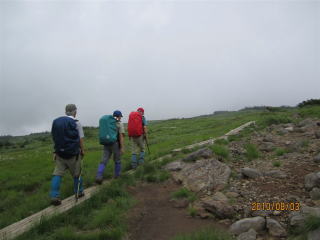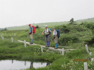 ゲレンデの草原を僅かに緩く登ってから右に進み、樹林帯に入ると本格的な登りになる。数10cmから1m以上の露岩が点在して水路のようになった泥道を登る。50分位登り、最初の休憩時にスパッツを付ける。下の芝まで登ると、左に木製の休憩場があり、登山道を整備する人がいた。歩き難い道はなおも続き、木製のテラスがある中の芝まで登って昼食にする。北面は開けているが、山霧で全く遠望が効かない。