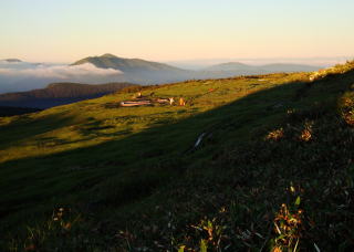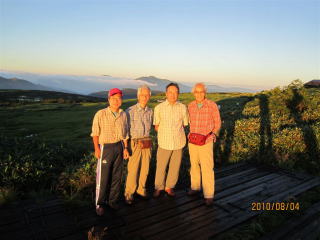 目を覚まして右横の小窓から見ると、朝焼けになっている。5時頃に4人で外に出る。鳥甲山から岩菅山、草津白根山等が間近に見え、遥か先には穂高や槍ヶ岳が視認できる。朝食はおかずを自分で取るバイキング方式。