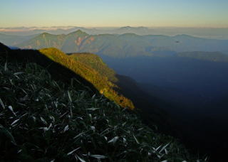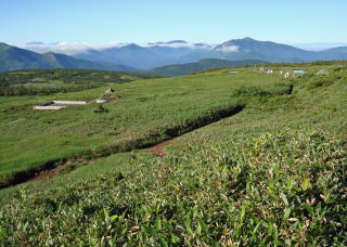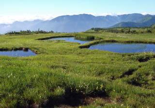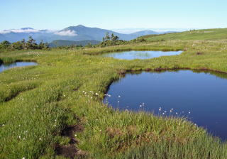 | 雷雨が心配だったが、無事に歩けた。苗場山手前の鞍部には多種の花が咲き乱れている。山頂周辺には多数の池塘があり、ワタスゲが揺れている。翌朝には槍を始め北アの連山を遠望できた。 | |||