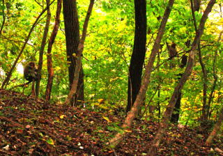 概要: 30日に掃部ヶ岳と杏ヶ岳に登る予定だったが台風のために中止し、予備の山行としていた陣馬山も中止にして、1日延期した。台風一過の好天を期待したが、出発時から小雨。但し、山道では傘を差すほどではない。一の尾根に登る途中で、10匹近い猿を見かける。猿は我々に気づいていると思うが無関心な様子で、木に登ったり、駆け廻ったりしている。陣馬山に着くと、山頂のベンチには誰もいなく、日曜日の山とは思えない静かさだ。この先は、ときたまトレランの人と会うが、ハイカーは非常に少ない。明王峠ではあばら屋の屋根がなくなっていたので、道の北側の木の下で雨を避けて昼食を取る。